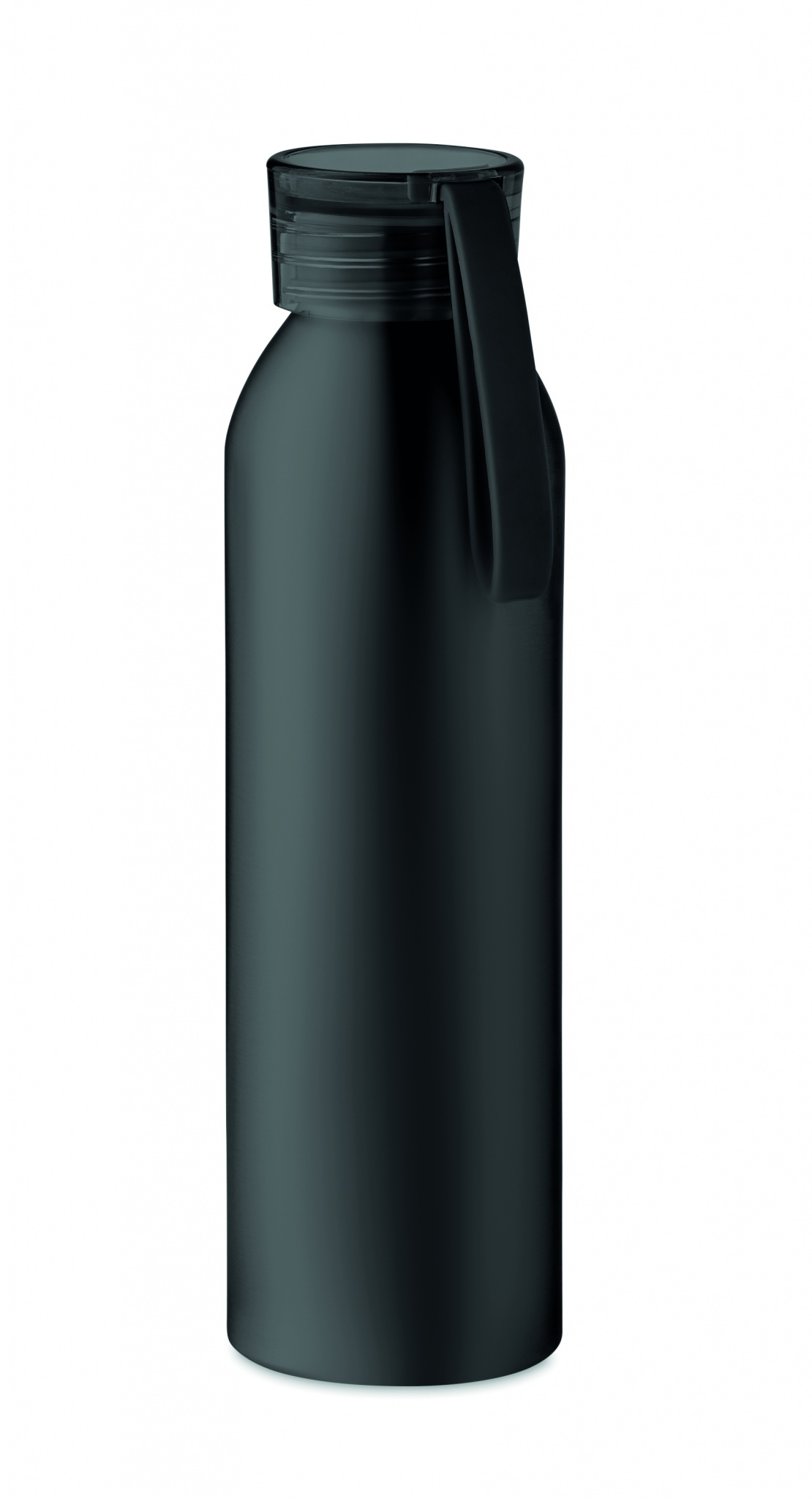 Einwandige Flasche aus recyceltem Aluminium mit Verschluss aus PS mit Silikon-Schlaufe. Füllmenge: 600 ml. Auslaufsicher.