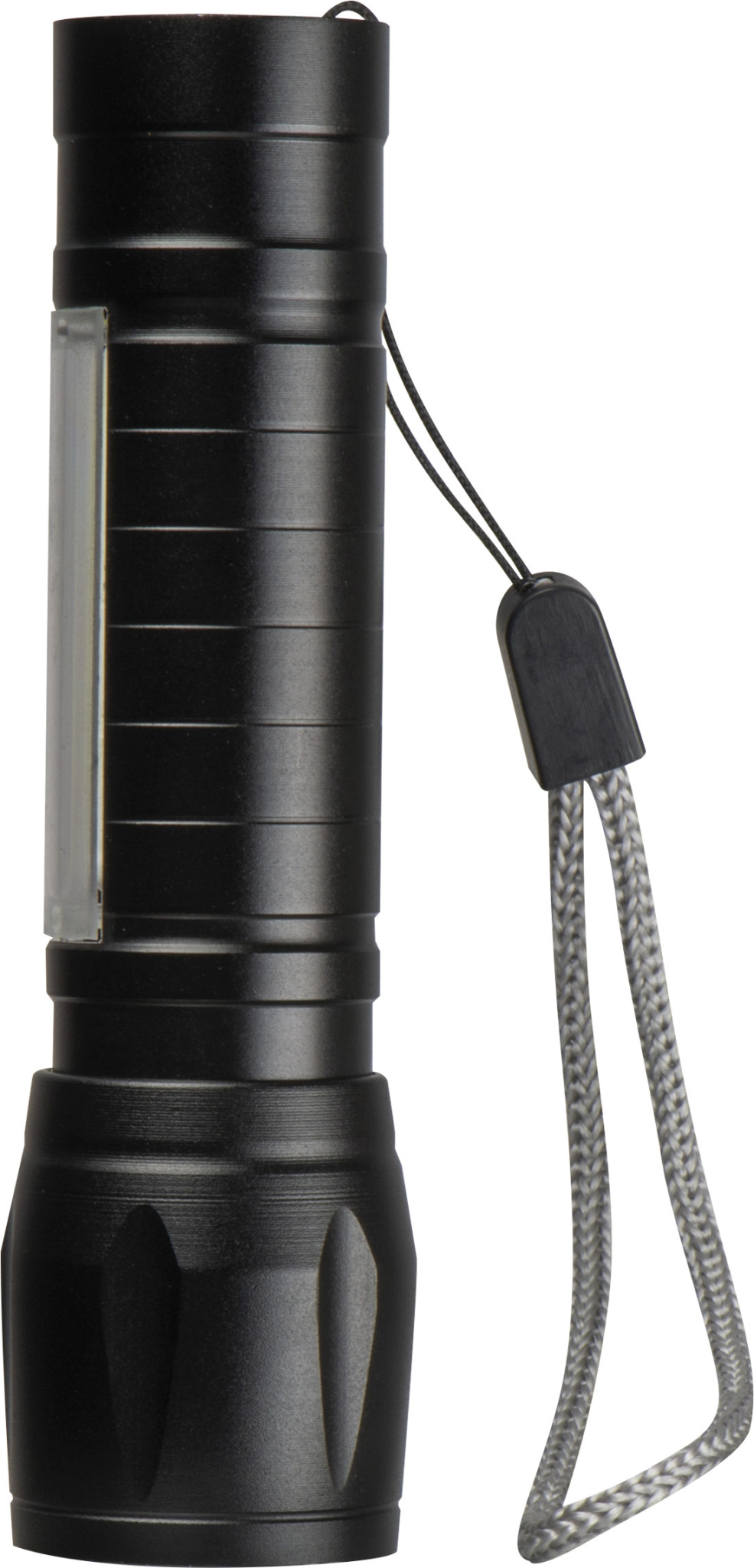 Wiederaufladbare Taschenlampe aus Aluminium (400 mAh) in einer schwarzen Box, inklusive USB-C-Ladekabel. Die Taschenlampe verfügt über ein COB-Licht mit einstellbarem Strahl und ein COB-Licht am Schaft. Ihr Logo wird in der Mitte des Boxdeckels gedruckt.