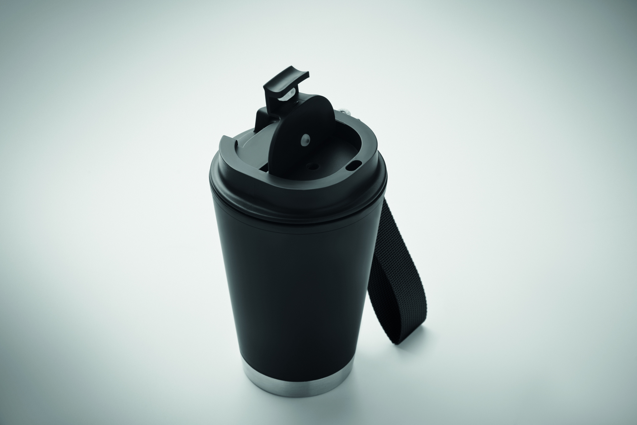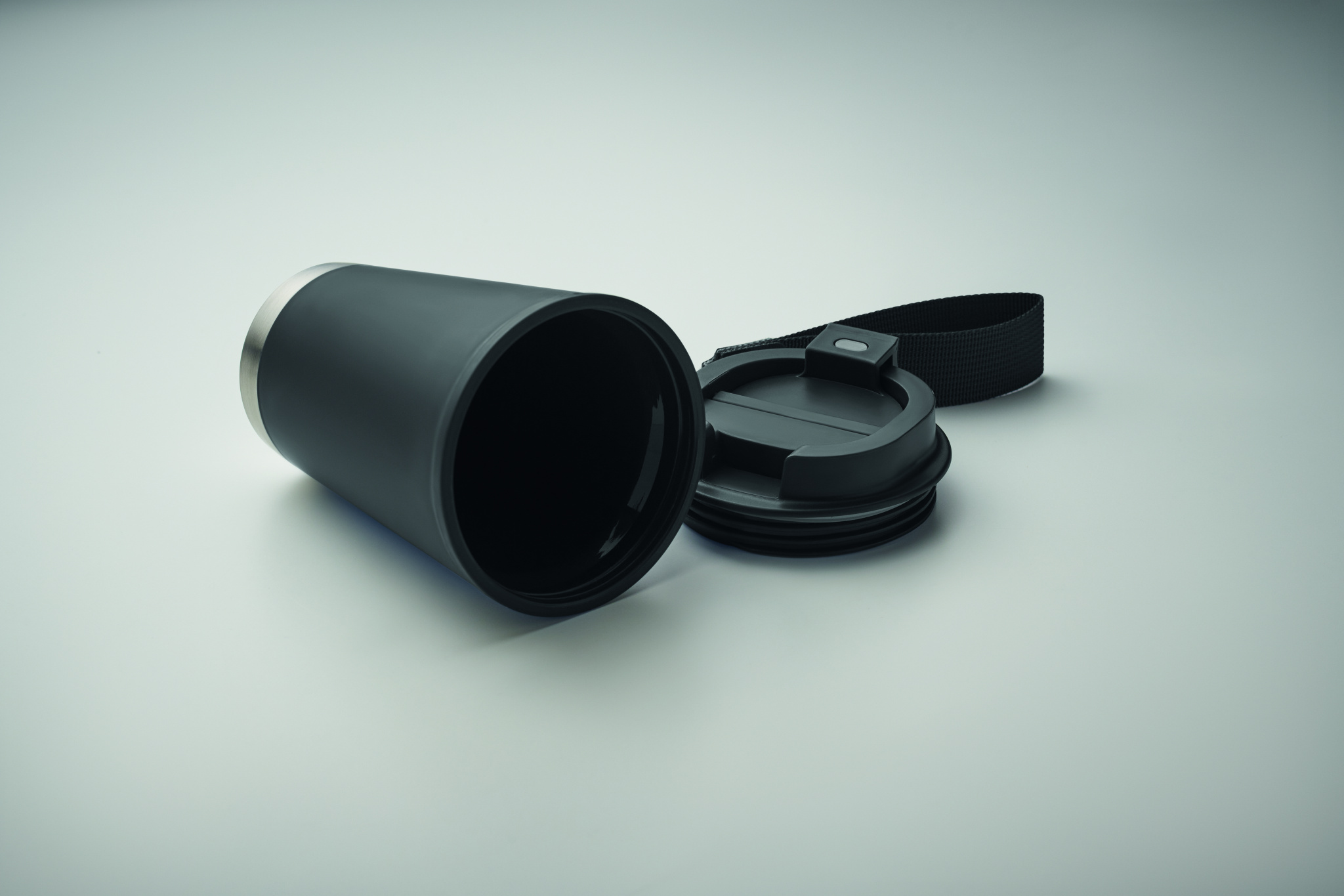 Doppelwandiger Becher mit Innenseite aus PP, Außenseite aus recyceltem PP, Details aus recyceltem Edelstahl. RPET-Handschlaufe. Füllmenge: 300 ml.