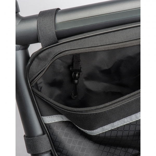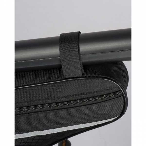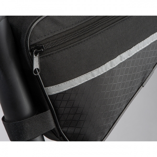 Fahrradtasche aus strapazierfähigem 600D Polyester mit Reflektorstreifen. Die Tasche lässt sich mithilfe der Halterungen einfach an der mittleren Rahmenstrebe befestigen und bietet ausreichend Platz für alle wichtigen Utensilien. Ihre Werbung drucken wir auf die Tasche.