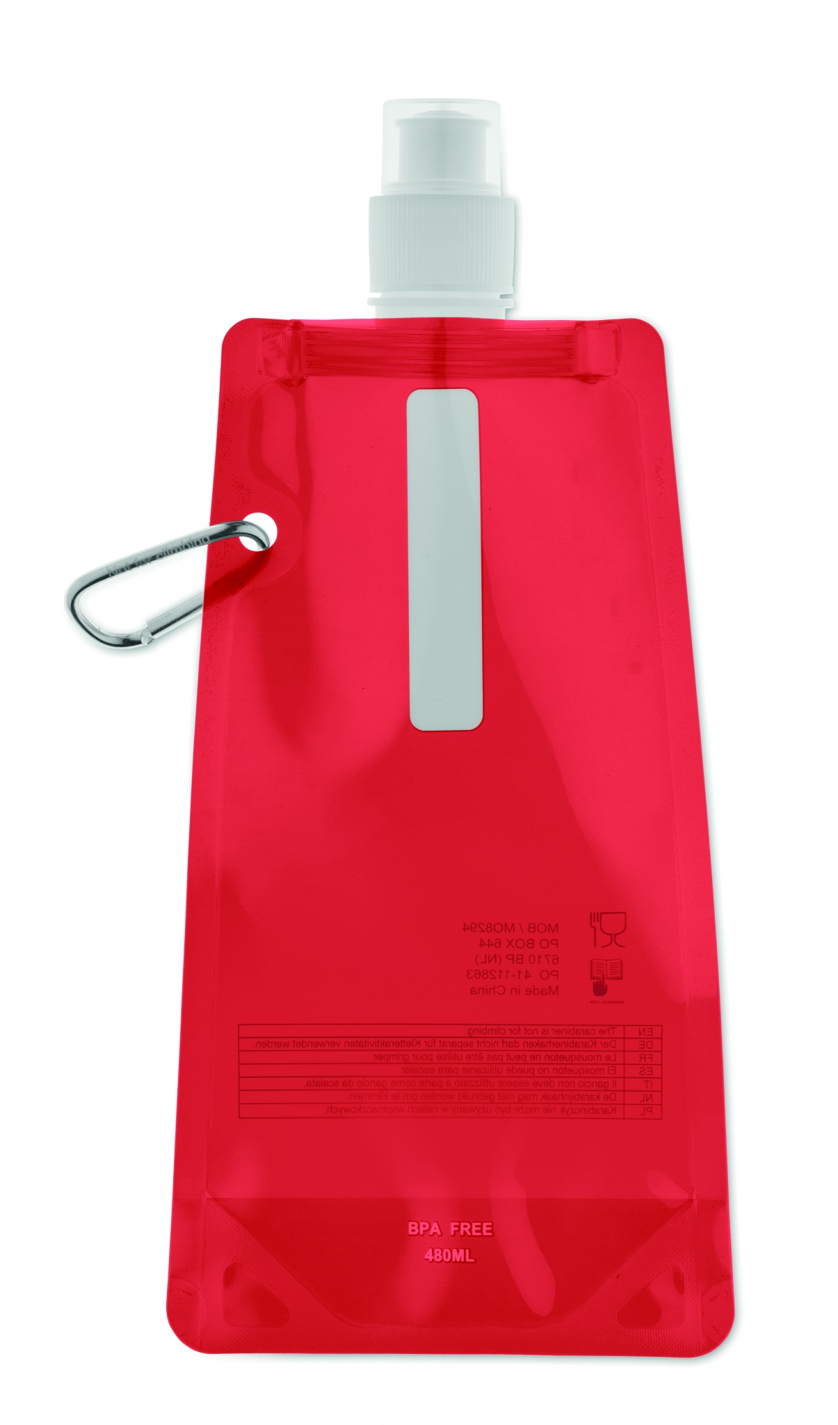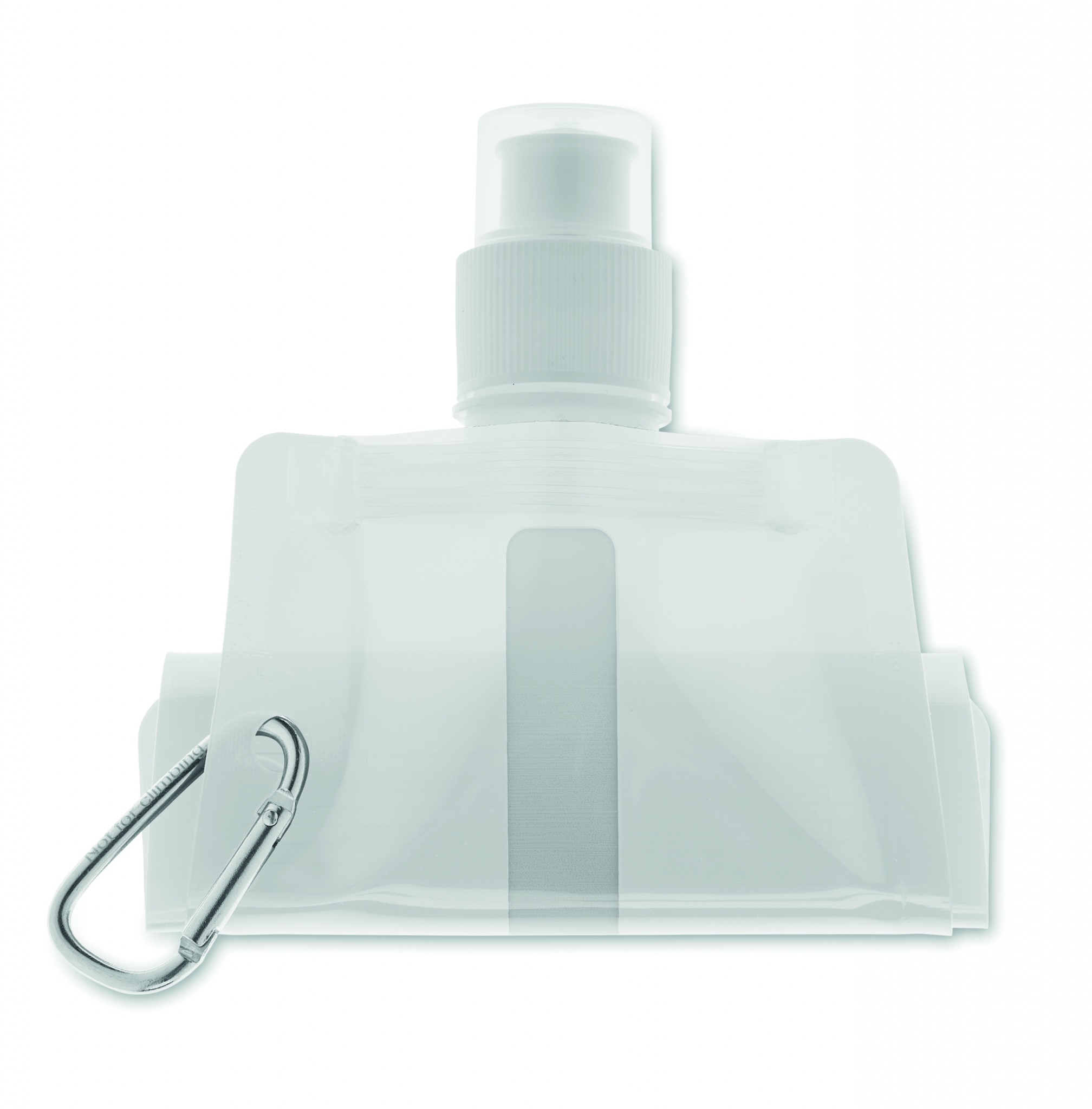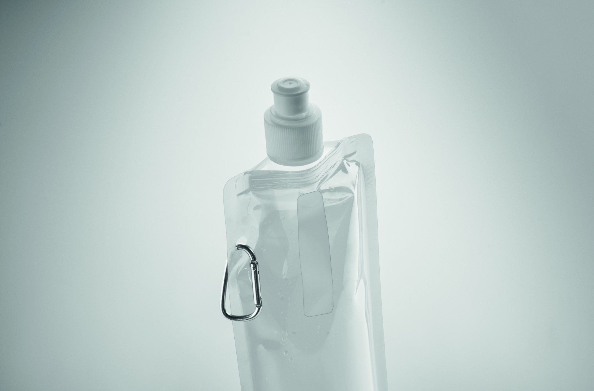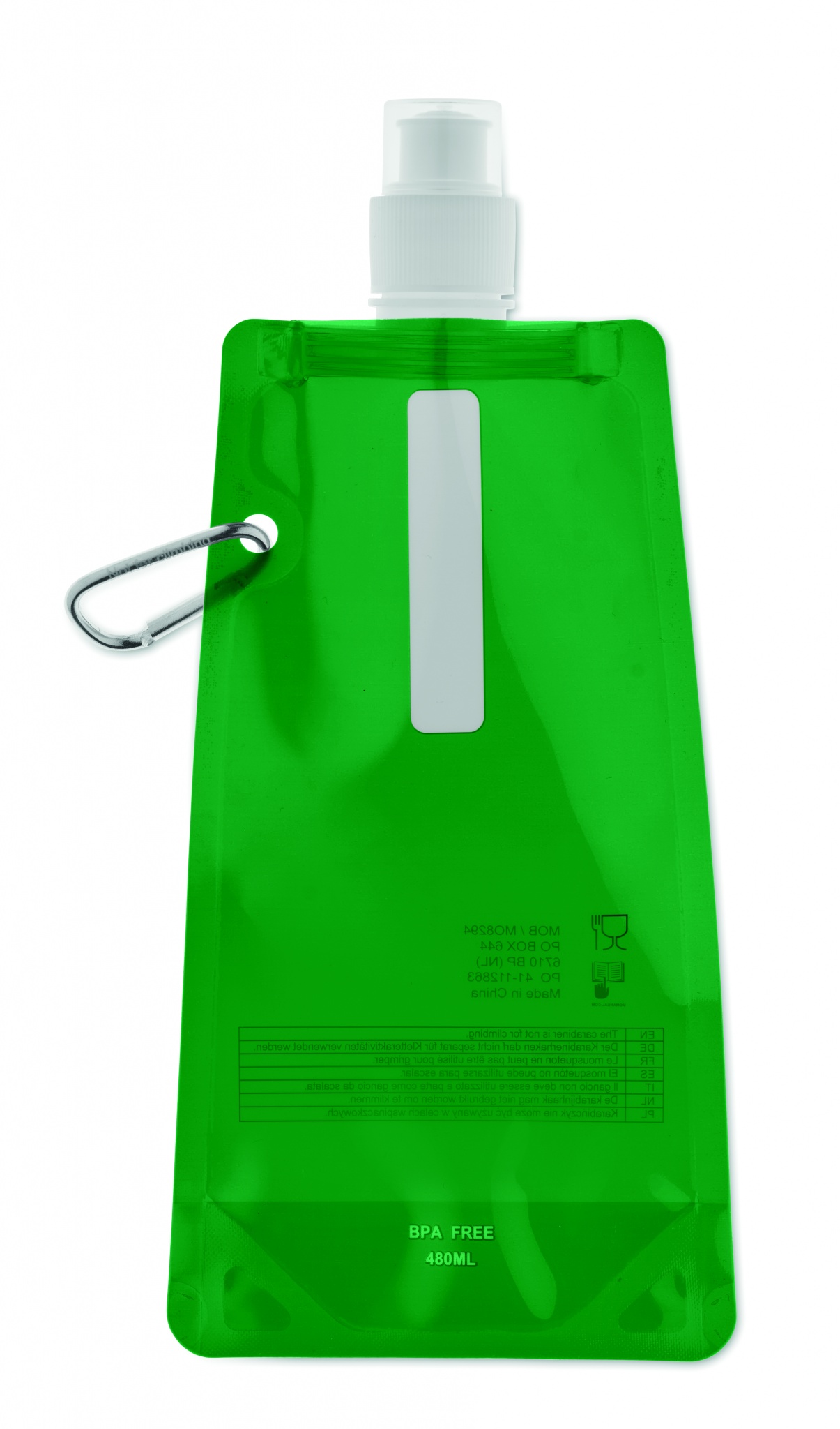 Faltbare Wasserflasche aus BPA freiem PET mit Alu-Karabiner. Füllmenge: 480 ml.