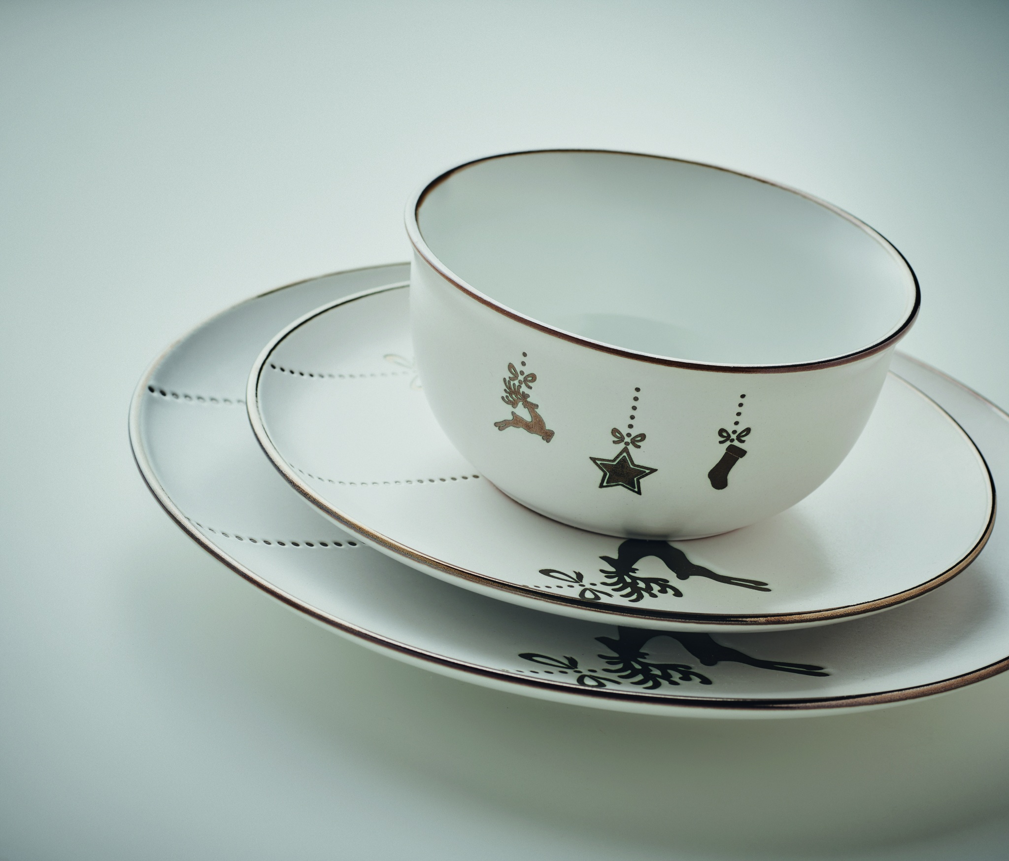 Weihnachtliches 4-teiliges Geschirr-Set aus Keramik. Bestehend aus großem Teller, Frühstücksteller, Müsli-/Salatschale (500 ml) und Becher (300 ml). Lieferung in einer Geschenkbox.