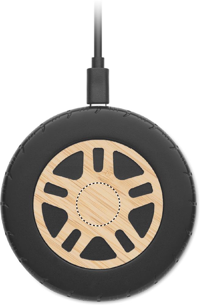 Kabellose Ladestation 15W in Optik eines Autoreifens. Recyceltes ABS mit Bambus-Dekor. Verbinden Sie das Gerät mit dem Computer und laden Sie Ihr Smartphone durch einfaches Auflegen auf. Ausgang: DC 9V/1.10A (15W) für schnelles Aufladen. Kompatibel mit allen QI-fähigen Geräten wie den neuesten Android Smartphones, iPhone® 8 und X und höher.