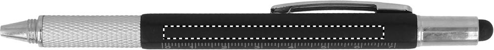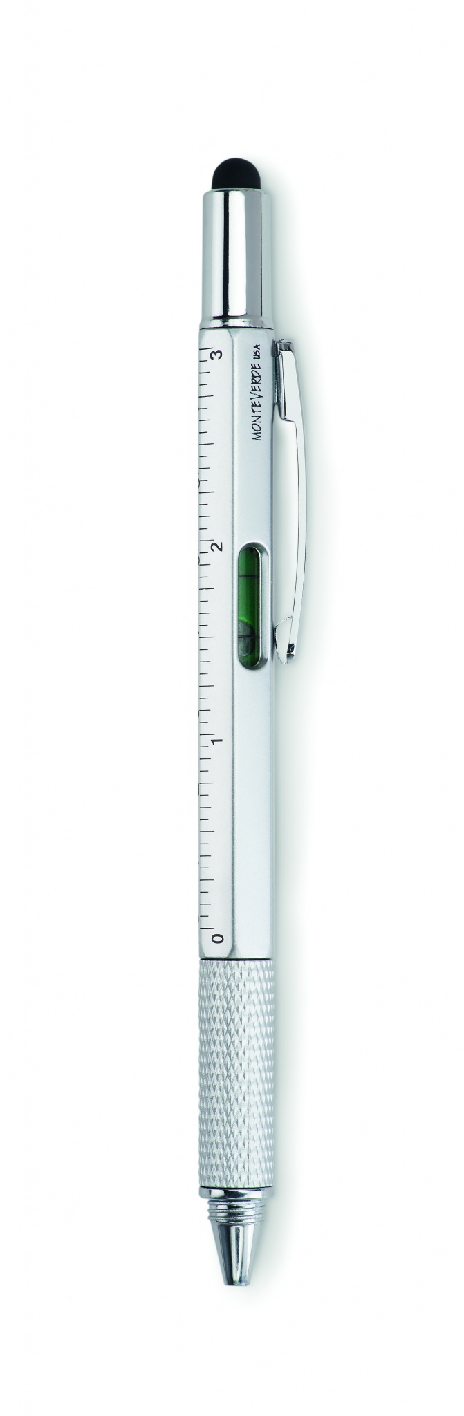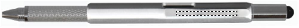 Drehkugelschreiber mit Stylus, aufgedrucktem Lineal und Mini-Wasserwaage (Gimmick),sowie integriertem Kreuz- und Schlitzschraubenzieher. Schwarze Tinte.