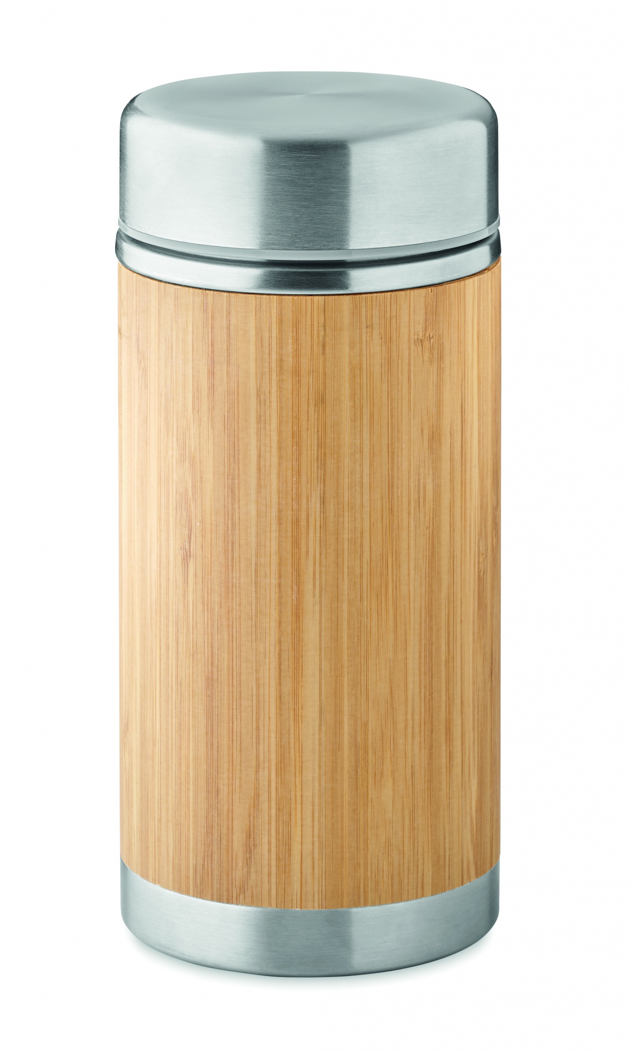 Doppelwandiger, isolierender Lebensmittelbehälter aus Edelstahl mit Bambus-Finish. Schraubverschluss. Füllmenge: 600 ml. Bambus ist ein natürliches Produkt, es kann daher zu leichten Abweichungen in Farbe, Dekor und Maßen kommen.