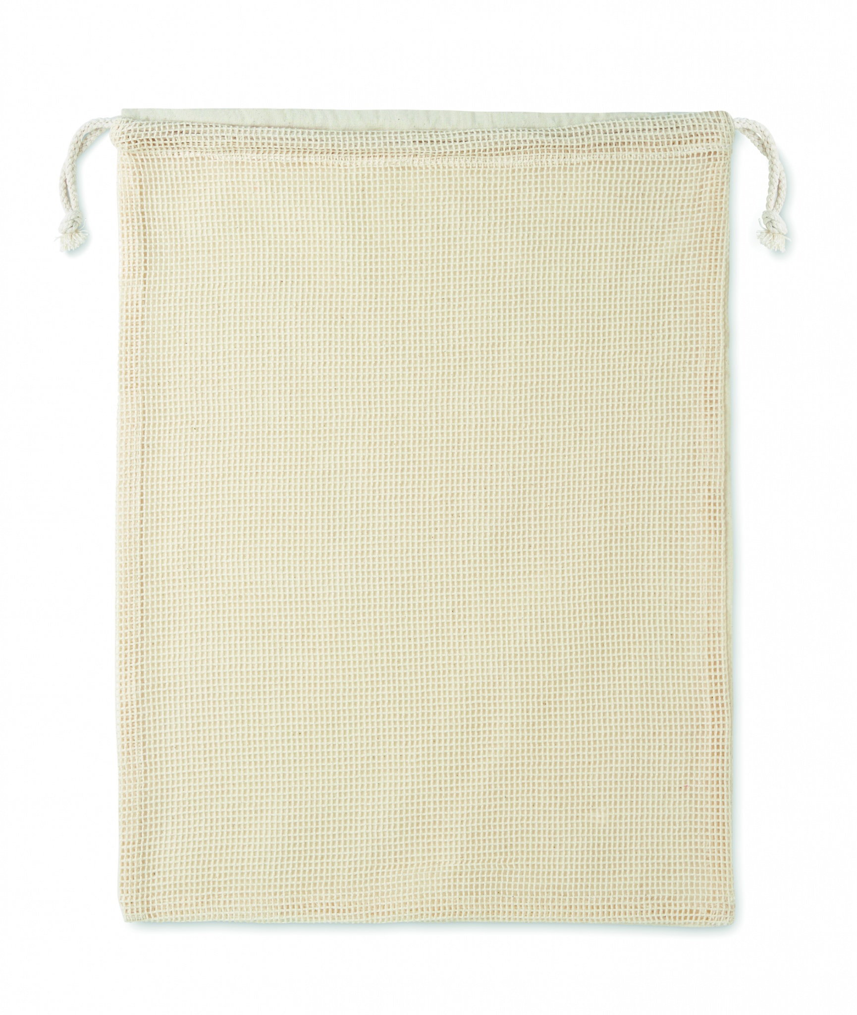 Wiederverwendbarer Netzbeutel für Obst/Gemüse. Eine Seite aus Baumwolle (140g/m²), die andere aus Mesh-Baumwolle (110g/m²). Kordelzug.
