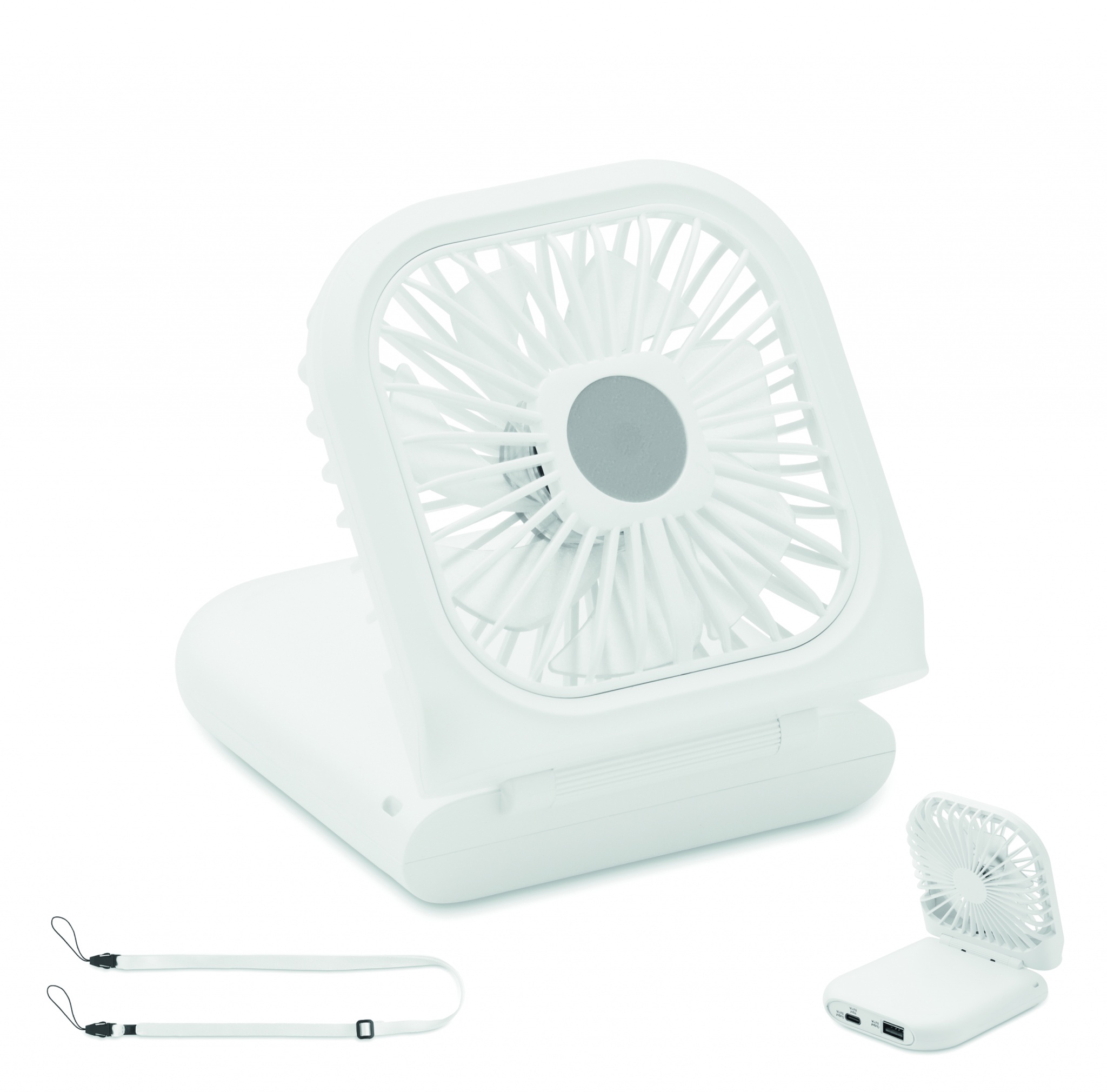 Powerbank mit tragbarem, klappbarem Ventilator. 3 Geschwindigkeitsstufen. Geklappt auch als Tischventilator verwendbar. Verstellbares Umhängeband. Wiederaufladbarer 3000-mAh-Akku mit USB- Anschluss.