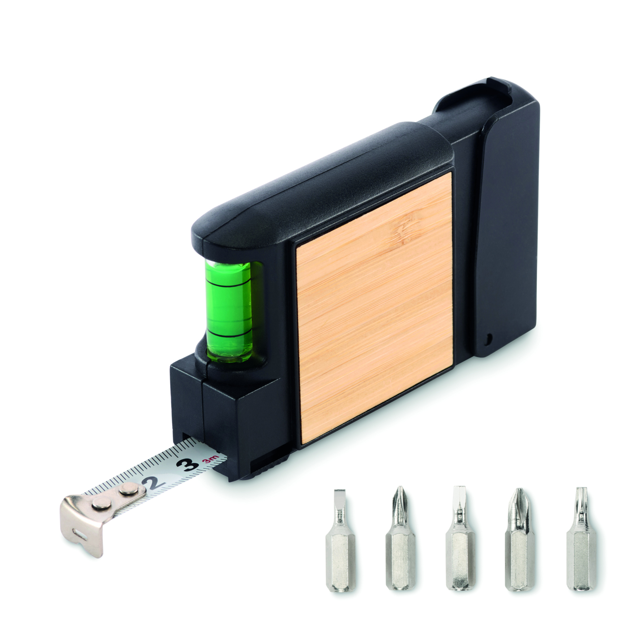 Multifunktionales Rollbandmaß mit Wasserwaage und Schraubendrehersatz mit 5 Bits. ABS mit Details aus Bambus. 3m. (Die Wasserwaage ist KEINE Präzisionswasserwaage).
