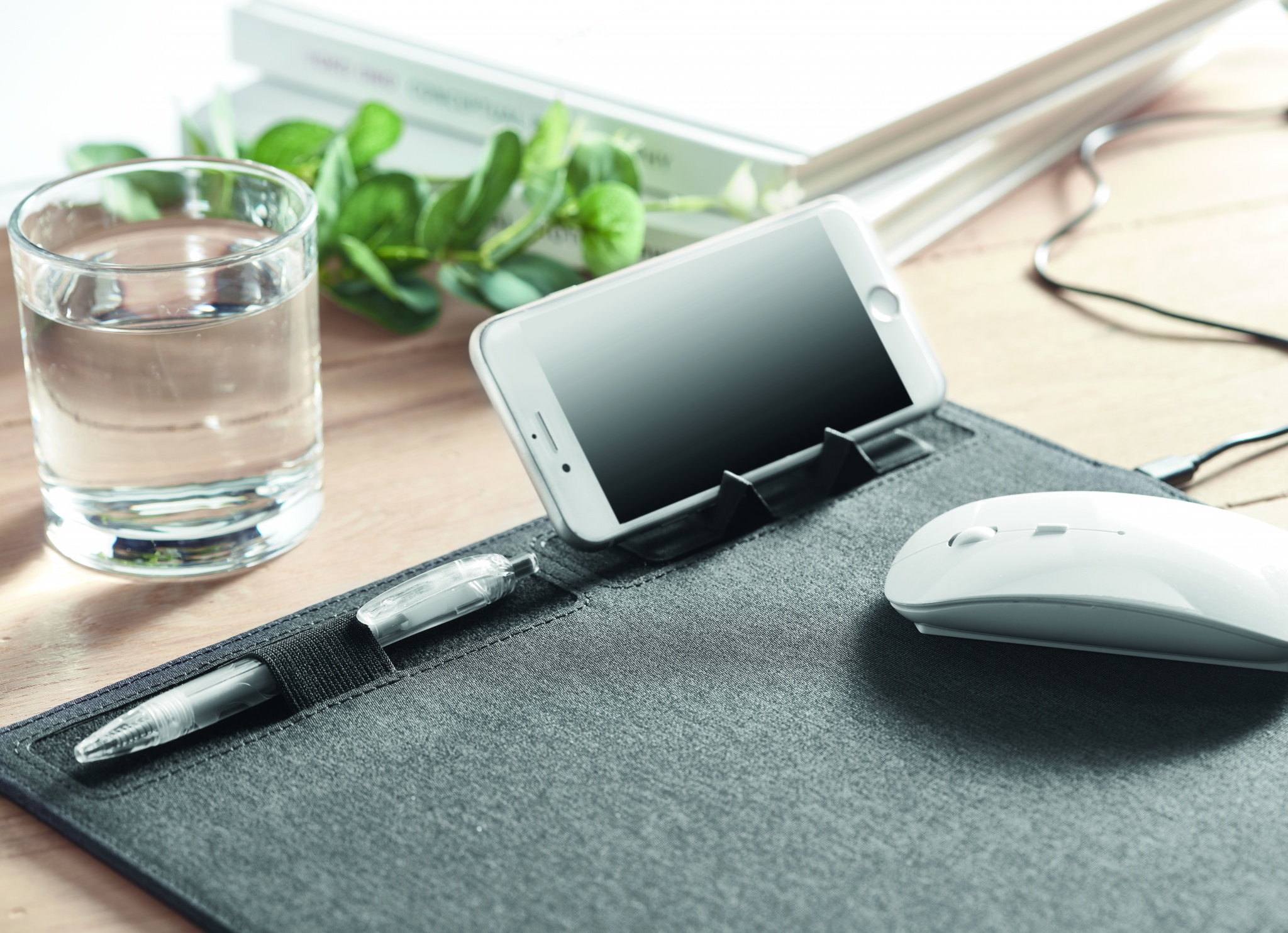 Multifunktionales 2tone Mousepad aus 300D-Polyester-RPET mit induktiver Ladestation und Smartphone-Halter. Ausgang: DC 9V/1.6A(15W) für schnelles Aufladen. Kompatibel mit den neuesten Android Smartphones, iPhone® 8, 8S und X und höher.