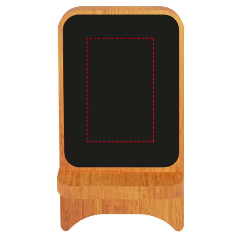 Kabelloses 10-Watt-Ladegerät aus Bambus mit antibakterielle Behandlung der Soft-Touch-Ladefläche und leuchtendem Logo. Typ C Eingang. Lieferung in schwarzer Geschenkbox aus recyceltem Kraftpapier inklusive Kabel aus recyceltem PET Kunststoff. Patent EUROPA EUIPO.