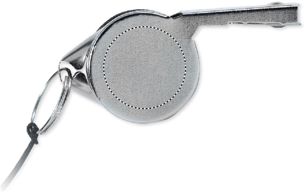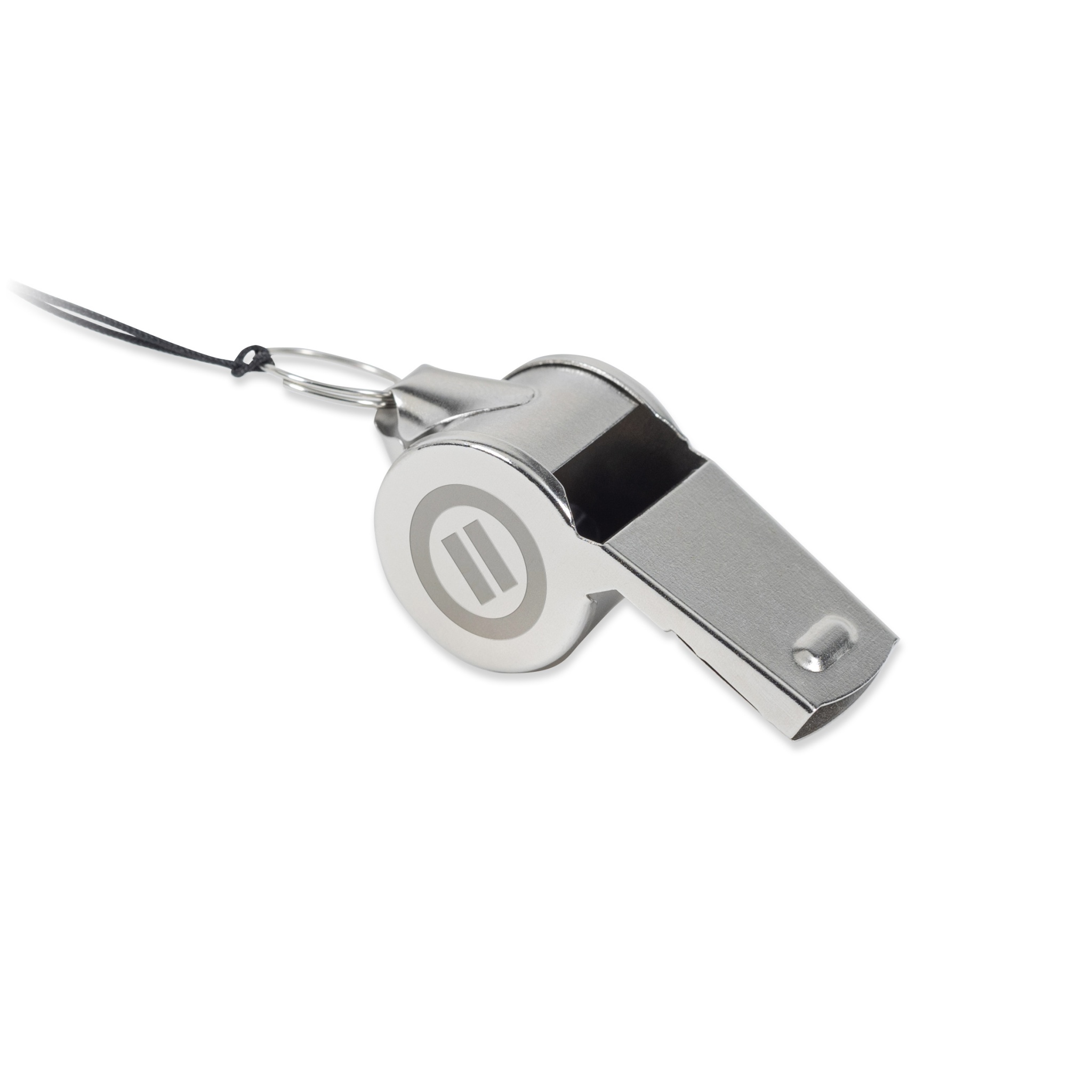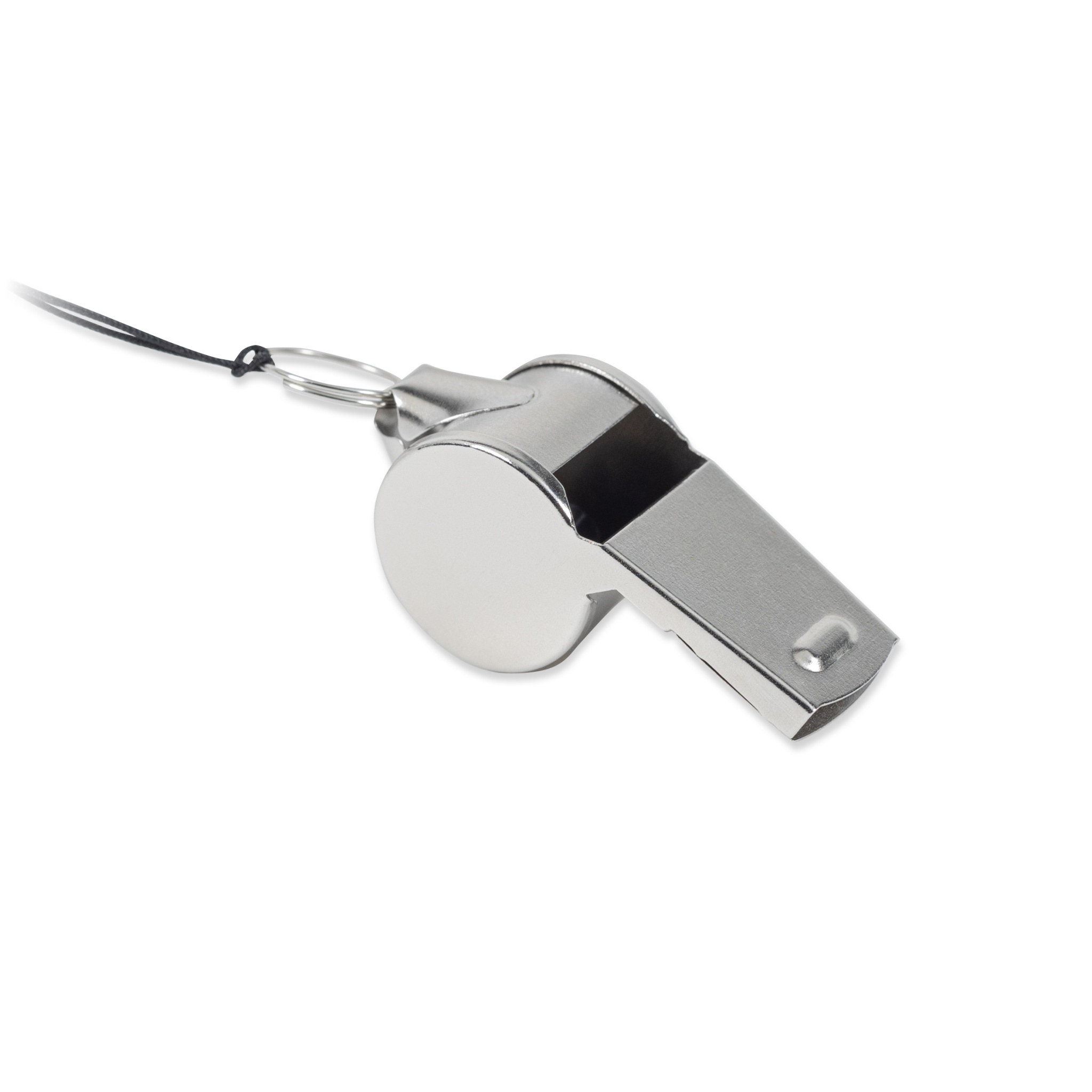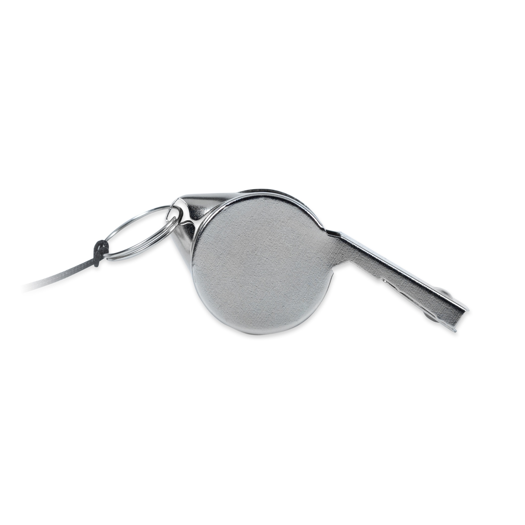 Trillerpfeife aus Metall. Inkl. Lanyard mit Panikverschluss.