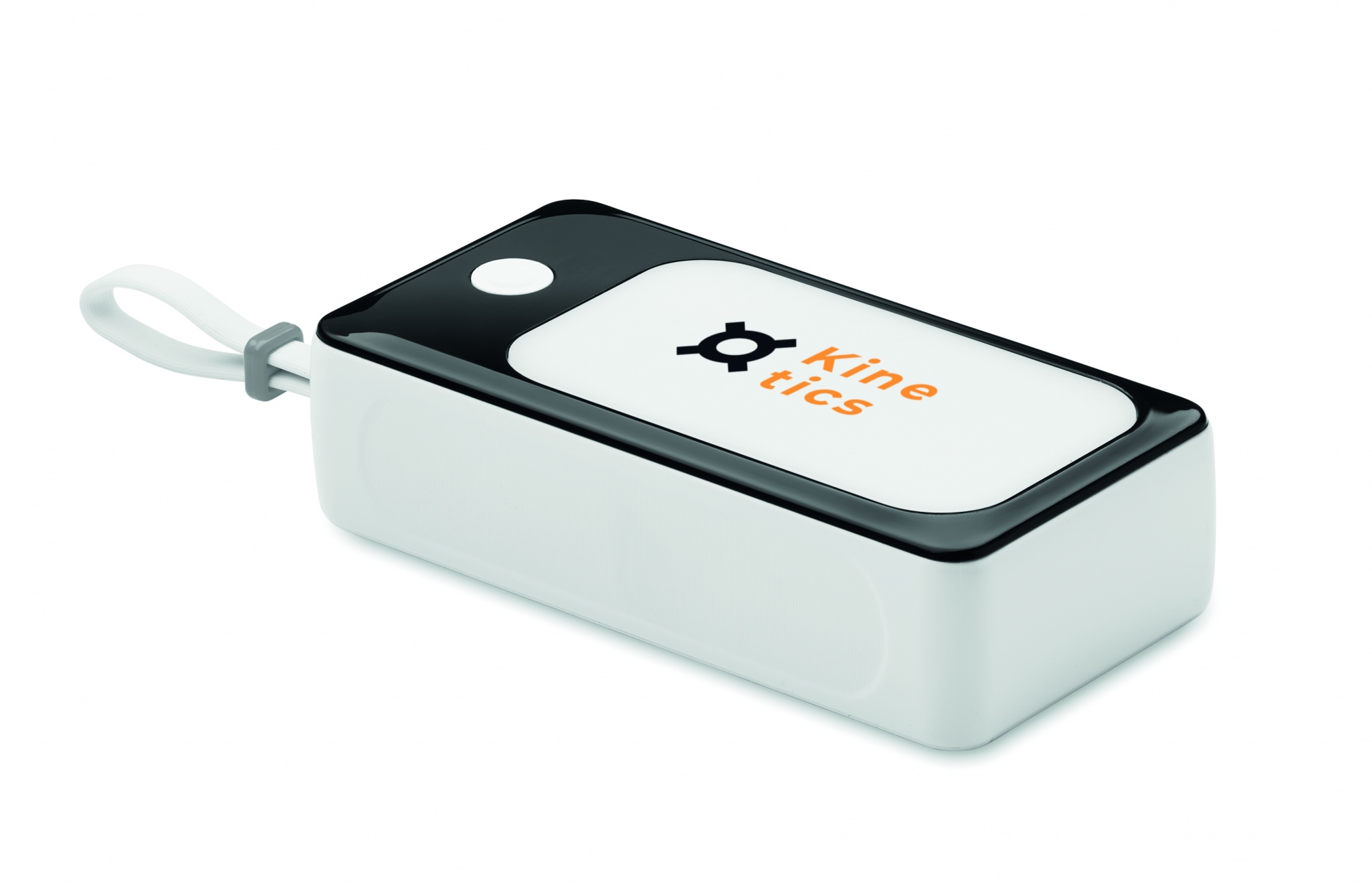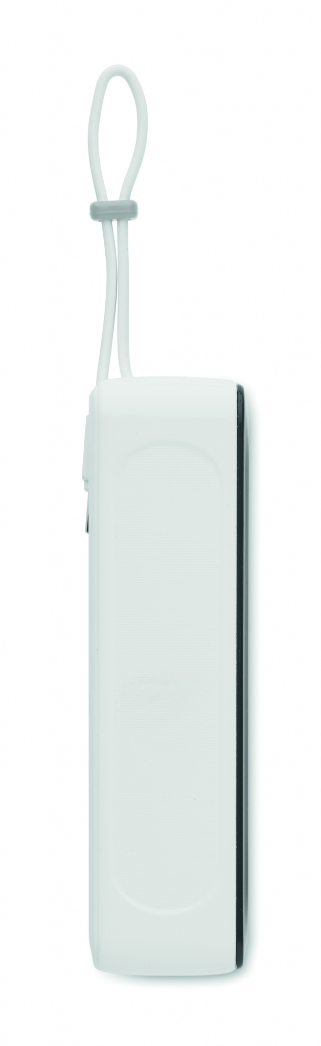 Power bank 10000 mAh capacity in abs casing. Output current DC5V/2A 1x type A and 1x type C in/out. Includes indicating 4 light setting (9 COB led) and integrated USB cable with Type C plug output. PD 22,5W support with battery display.