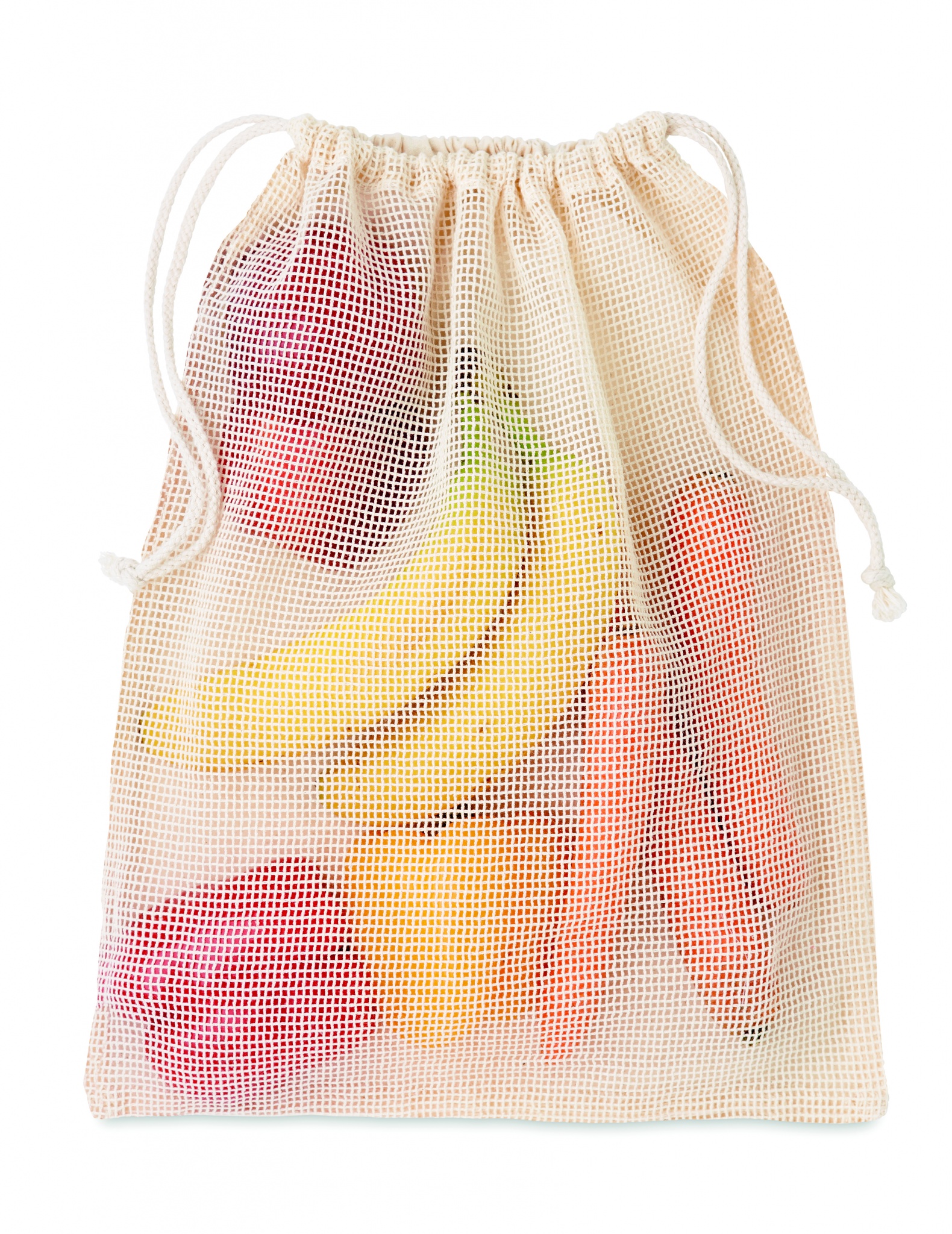 Re-usable food bag. One side is in cotton (140gr/m²) and other one is in mesh cotton (110gr/m²). Drawstring closure.