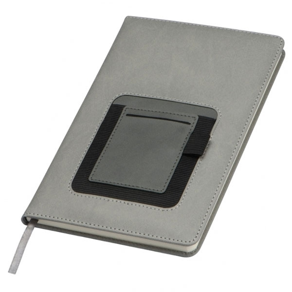 Elegant DIN A5 notebook with 160 dotted pages, bookmarks and a ballpoint pen loop, an insert and a smartphone compartment (width approx. 9 cm) on the outside of the cover. So everything is there and always ready to hand. We will print your logo on the outside of the cover.