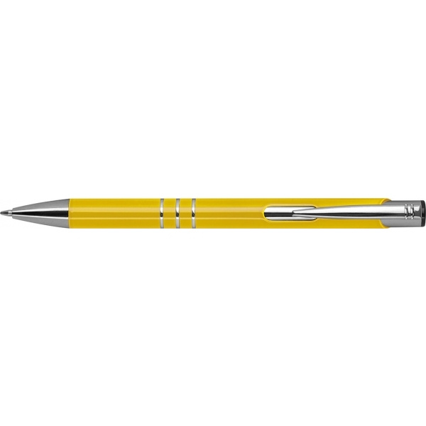 Fully lacquered metal ballpen with 3 decorative rings and blue-writing refill with large capacity. Your logo will be engraved to the right of the clip.