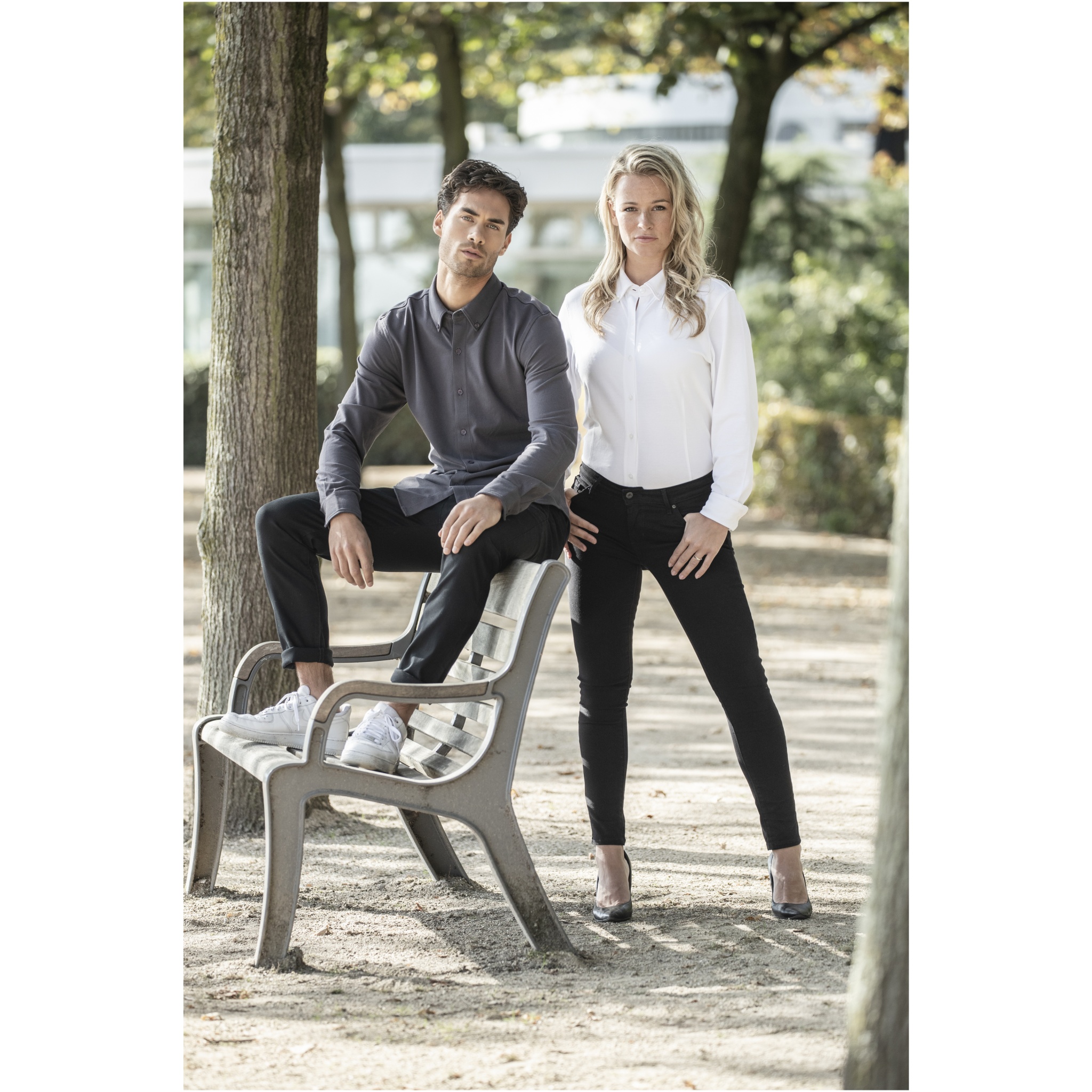 Self fabric collar. Stretch fabric. Adjustable cuff with single pleat. Button-down collar. Satin piping at inside neck. Dyed-to-match engraved buttons. Woven main label.