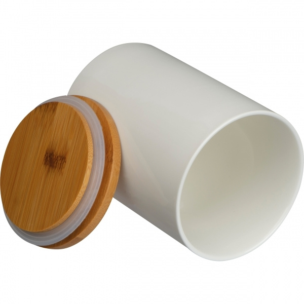 Ceramic storage jar with bamboo lid and silicone ring. With a capacity of 750 ml, this storage jar should not be missing in any kitchen. We laser your logo onto the bamboo lid.