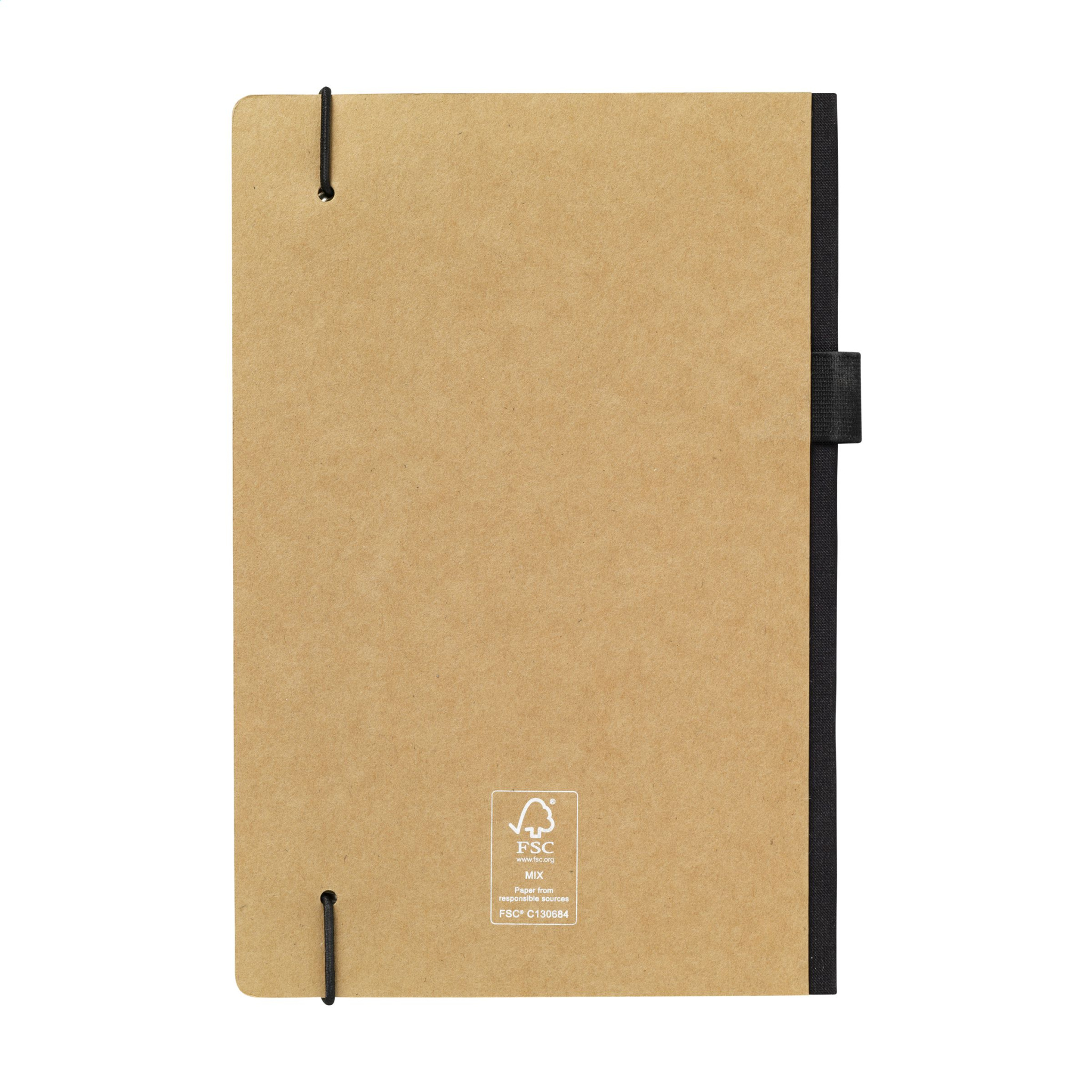 WoW! Practical notebook in A5 format. With a hard cover made from kraft cardboard (300 g/m²). This booklet has approx. 80 sheets/160 pages of cream-coloured, lined FSC Mix certified paper (80 g/m²) with a handy closing elastic and pen loop. On the inside of the back cover, you will also find a handy storage compartment.