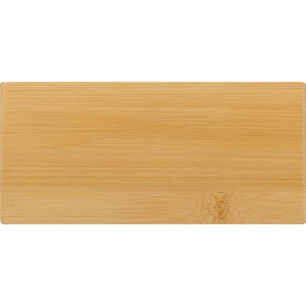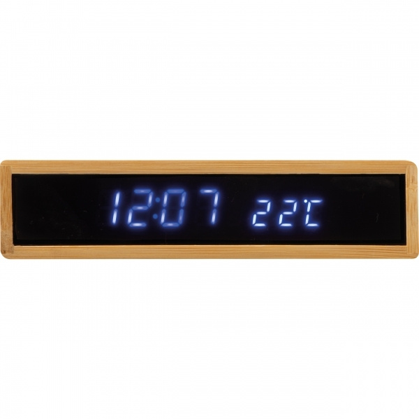 Digital desk clock made of bamboo with LED display, wireless charging, alarm function and temperature display. Your logo will be lasered onto the bamboo coating. Due to the natural bamboo grain, each item and each engraving is unique.