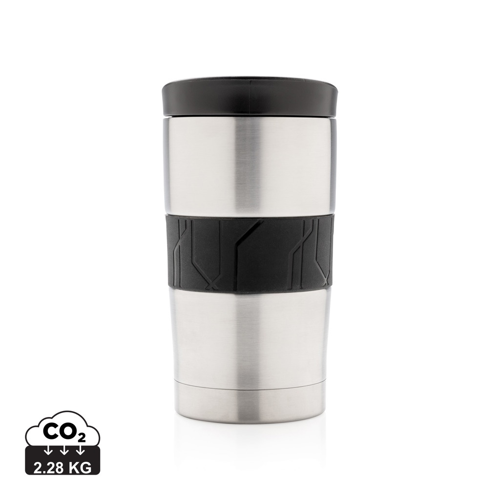 Leakproof vacuum mug made out of 304 stainless steel with silicone grip and slider lid. Dishwasher safe and suitable for most coffee machines. Convenient one-hand drinking. Content: 300ml.