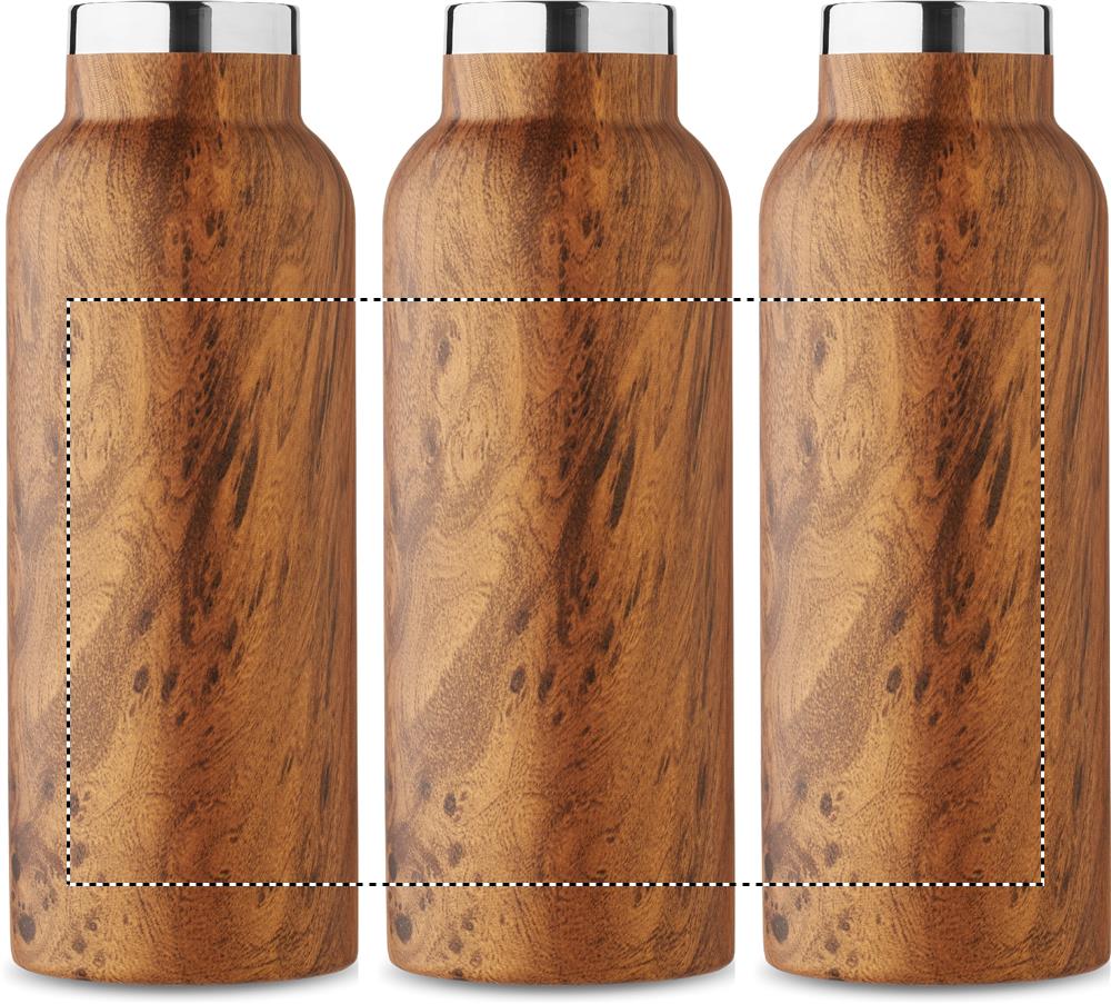 Double wall insulating vacuum bottle in recycled stainless steel (90% recycled stainless and 10% stainless steel) with wooden look and carry handle lid. Leak free. Capacity: 500 ml.