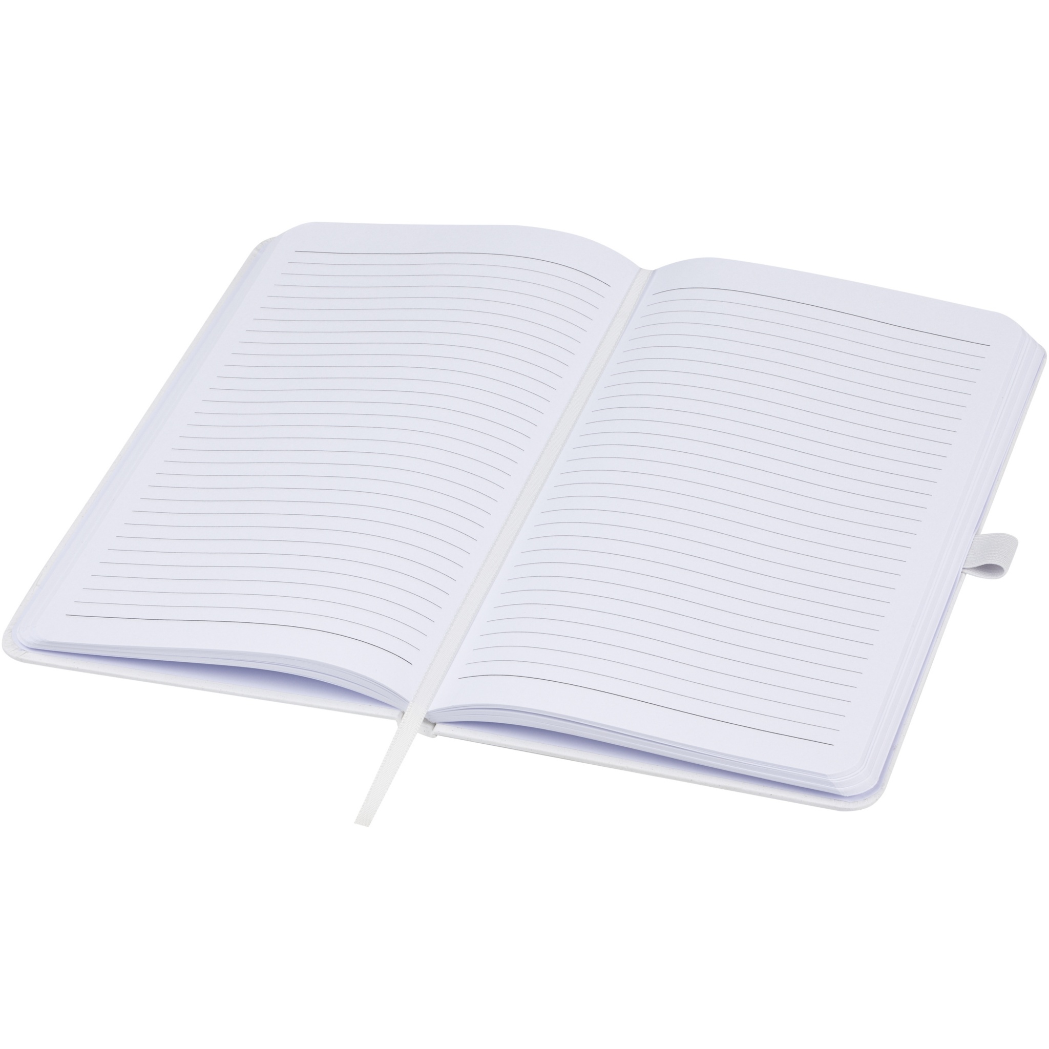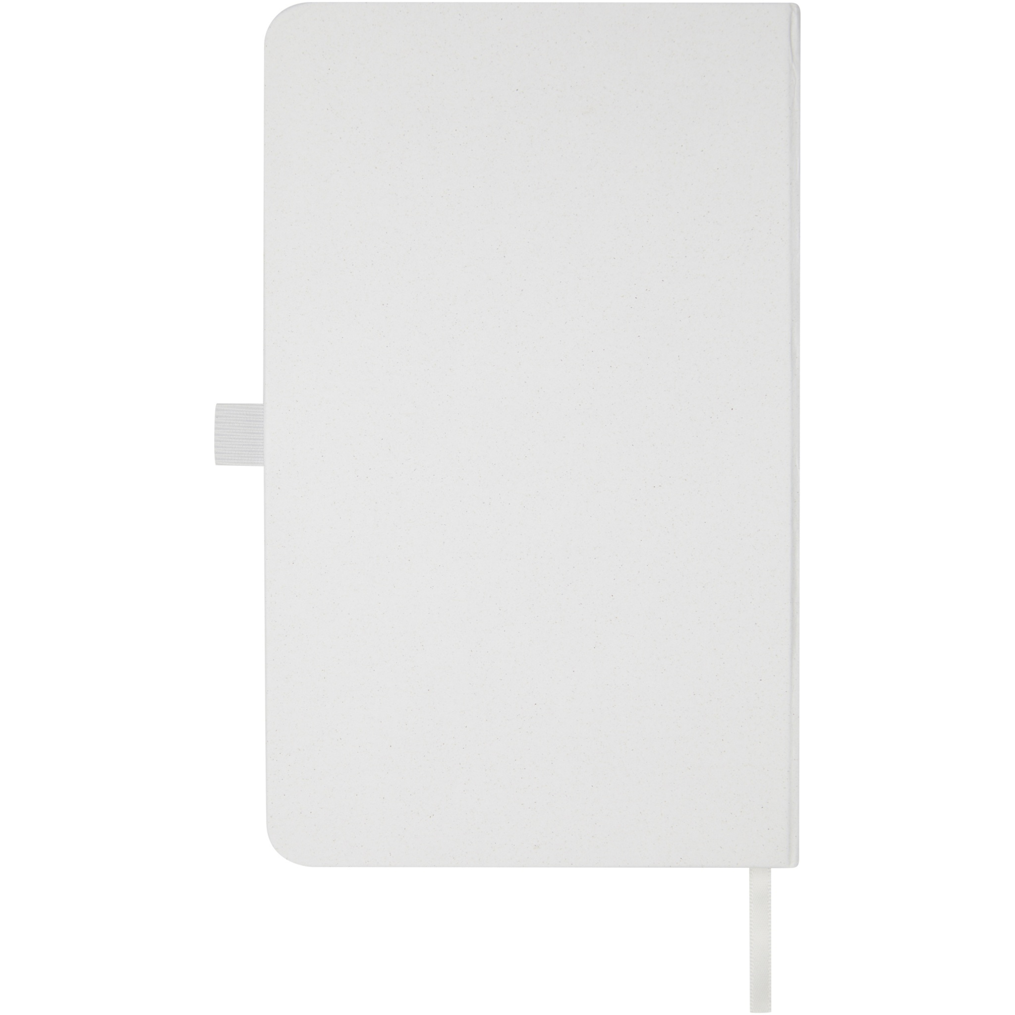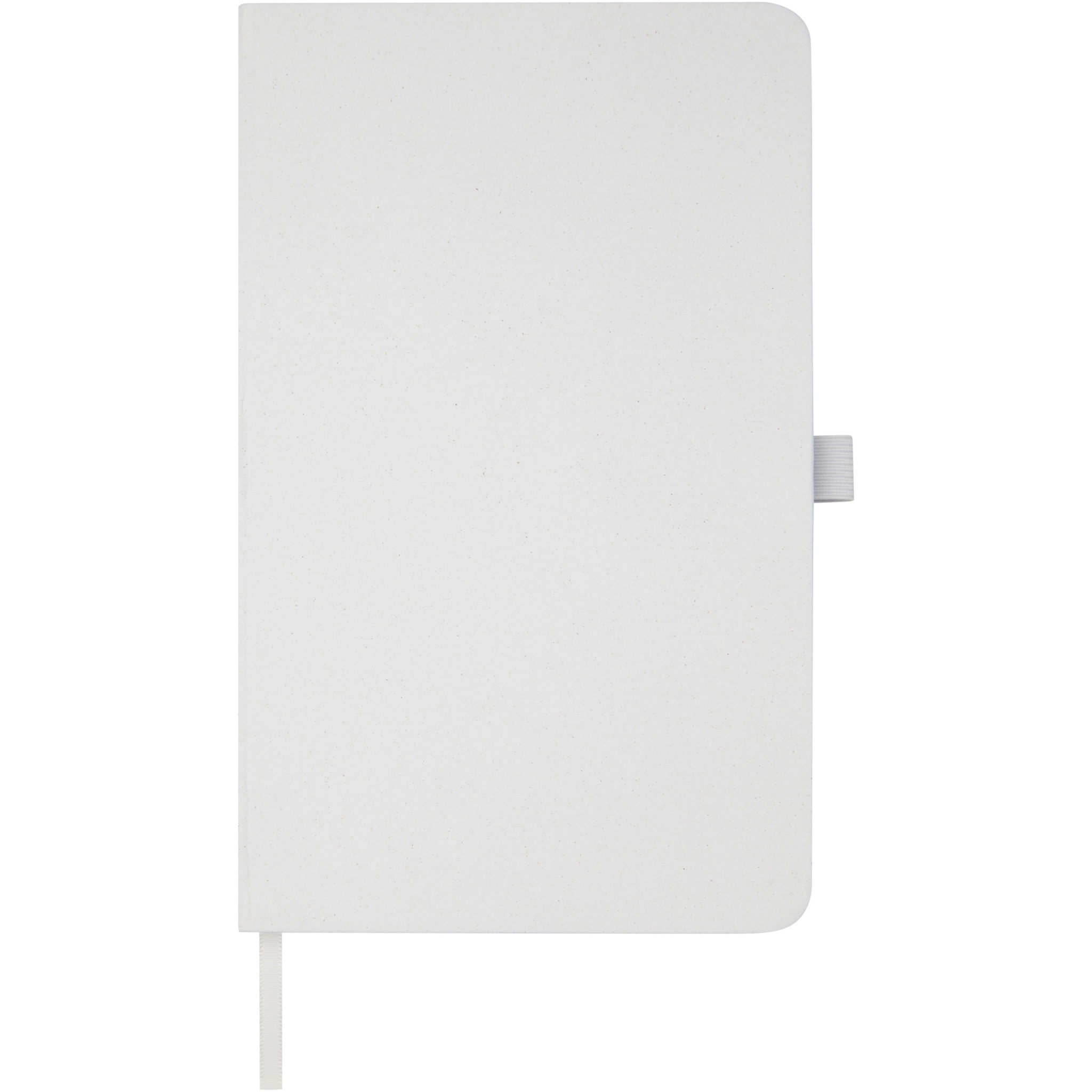 Lightweight hard cover notebook for everyday notetaking with a cover made from responsible sourced materials. The brown cover contains residue of coffee, the green cover includes residue of olives, and the white from corn. Features 80 sheets (70 g/m²) recycled white lined paper.