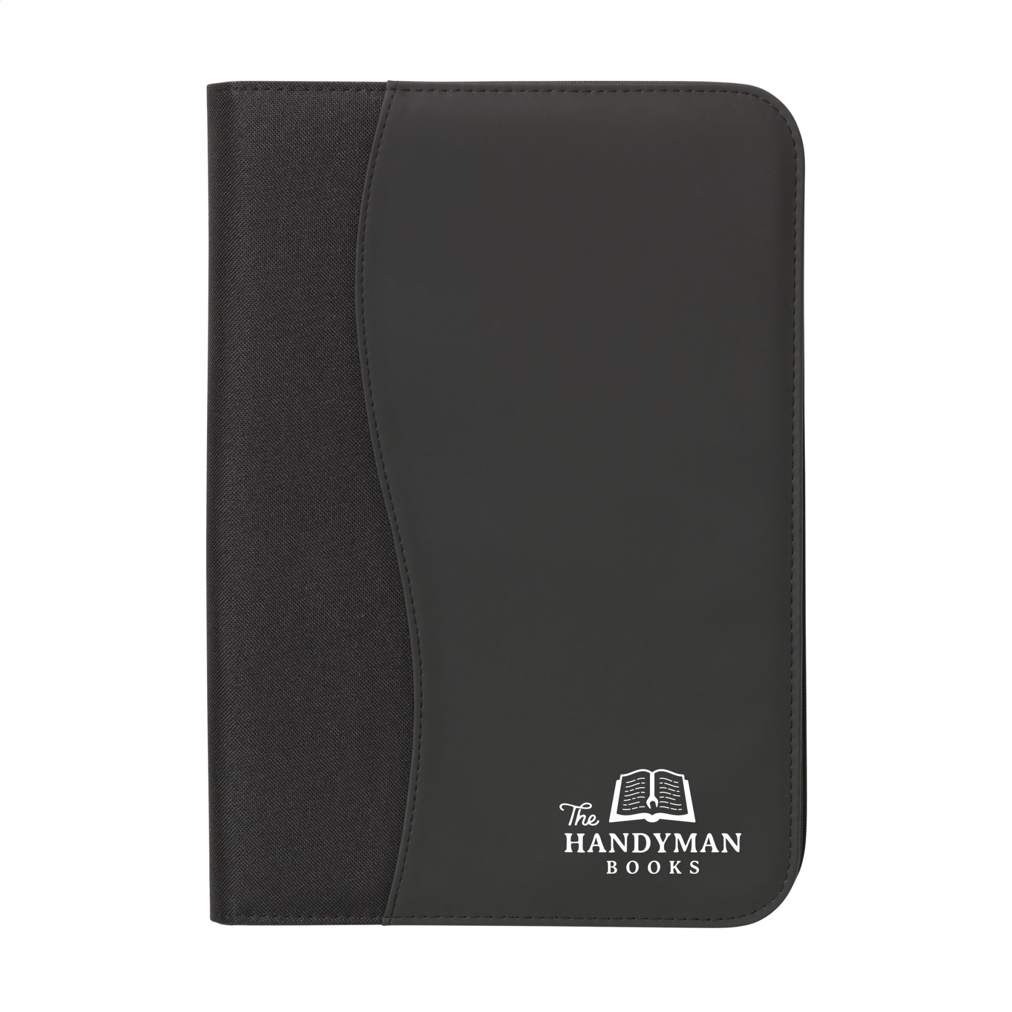 Conference/document folder made from 600D polyester/imitation leather in A4 format. With spacious storage, extra pocket on the back and zip closure. Incl. writing pad and ballpoint pen.