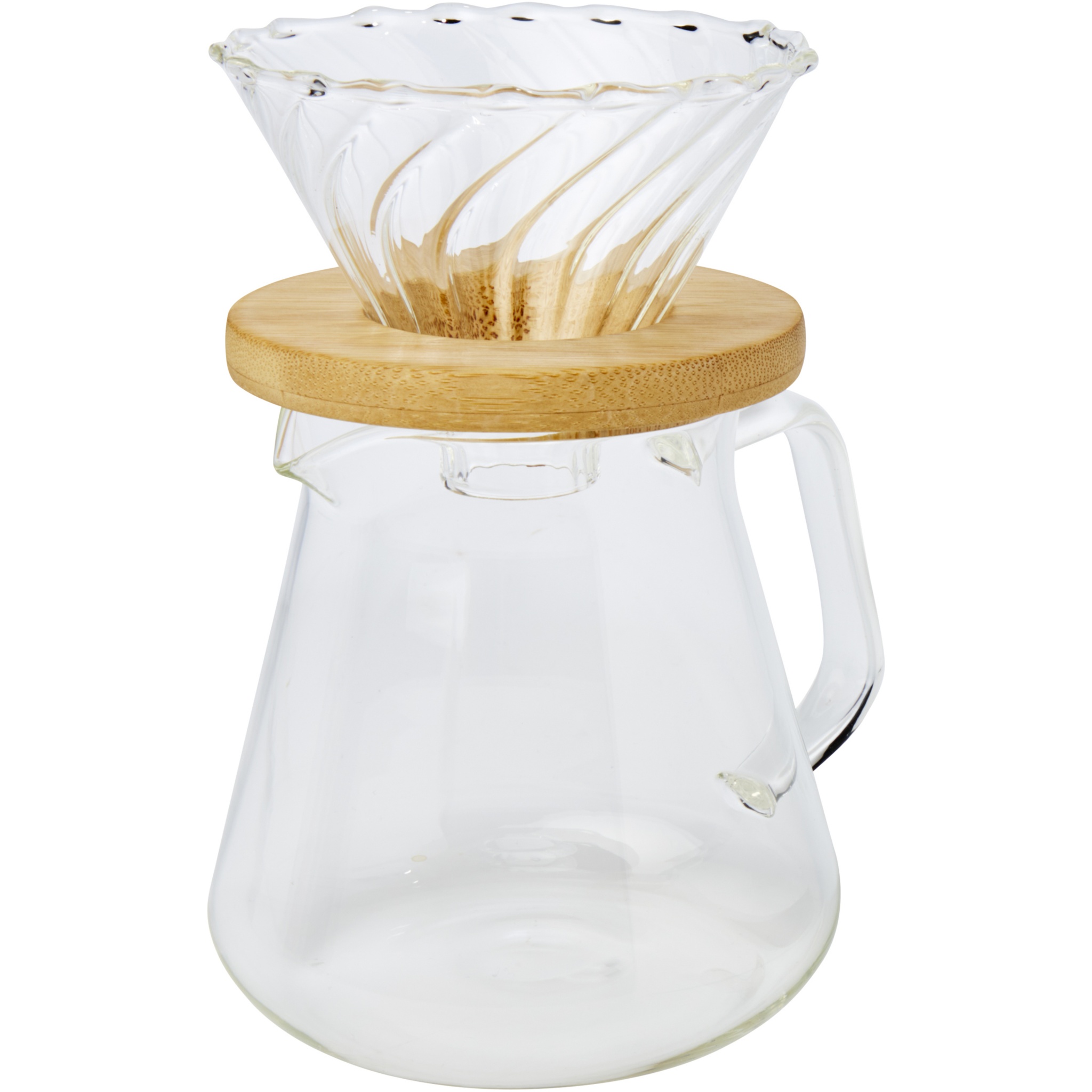 High-temperature-resistant glass espresso coffee maker with a capacity of 500 ml. The filter can be separated. Works with filter paper. The bamboo holder is from sustainable, environmentally, and socially responsible sources.