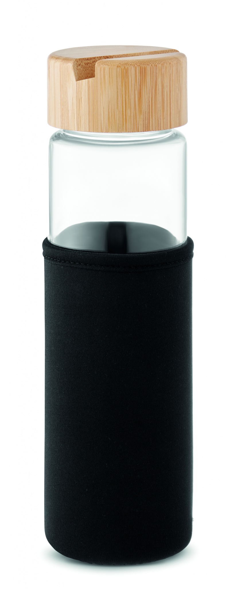 Glass bottle with neoprene sleeve, bamboo lid and smartphone stand functionality. Leak free. Capacity: 600 ml. Bamboo is a natural product, there may be slight variations in colour and size per item, which can affect the final decoration outcome.