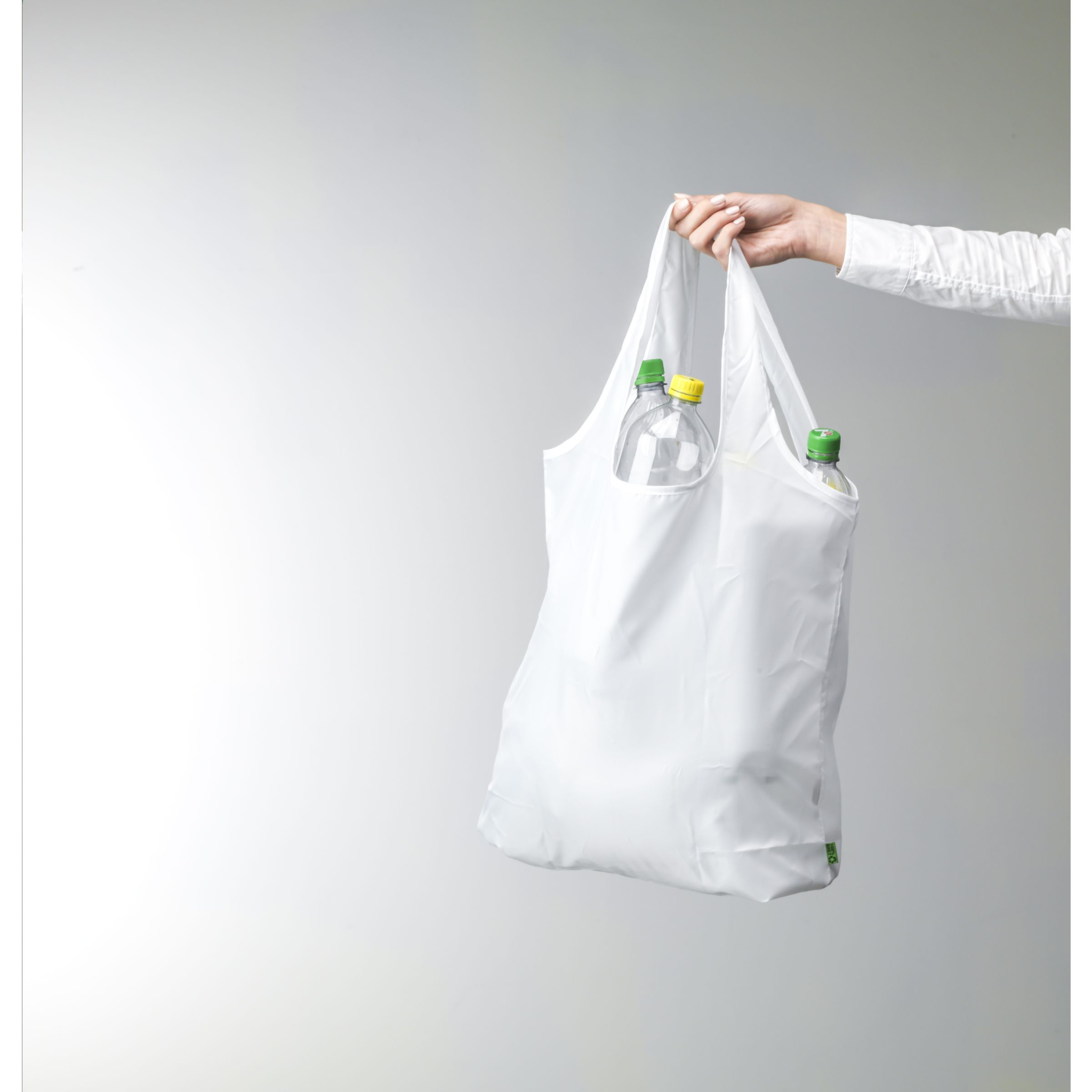 WoW! Large, foldable shopping bag with double handle made from 190T RPET polyester. Can be quickly folded into the pouch on the inside of the bag and carried along. GRS-certified. Total recycled material: 95%. Capacity approx. 10 liters. Meas. unfolded 42 x 8 x 45 cm.