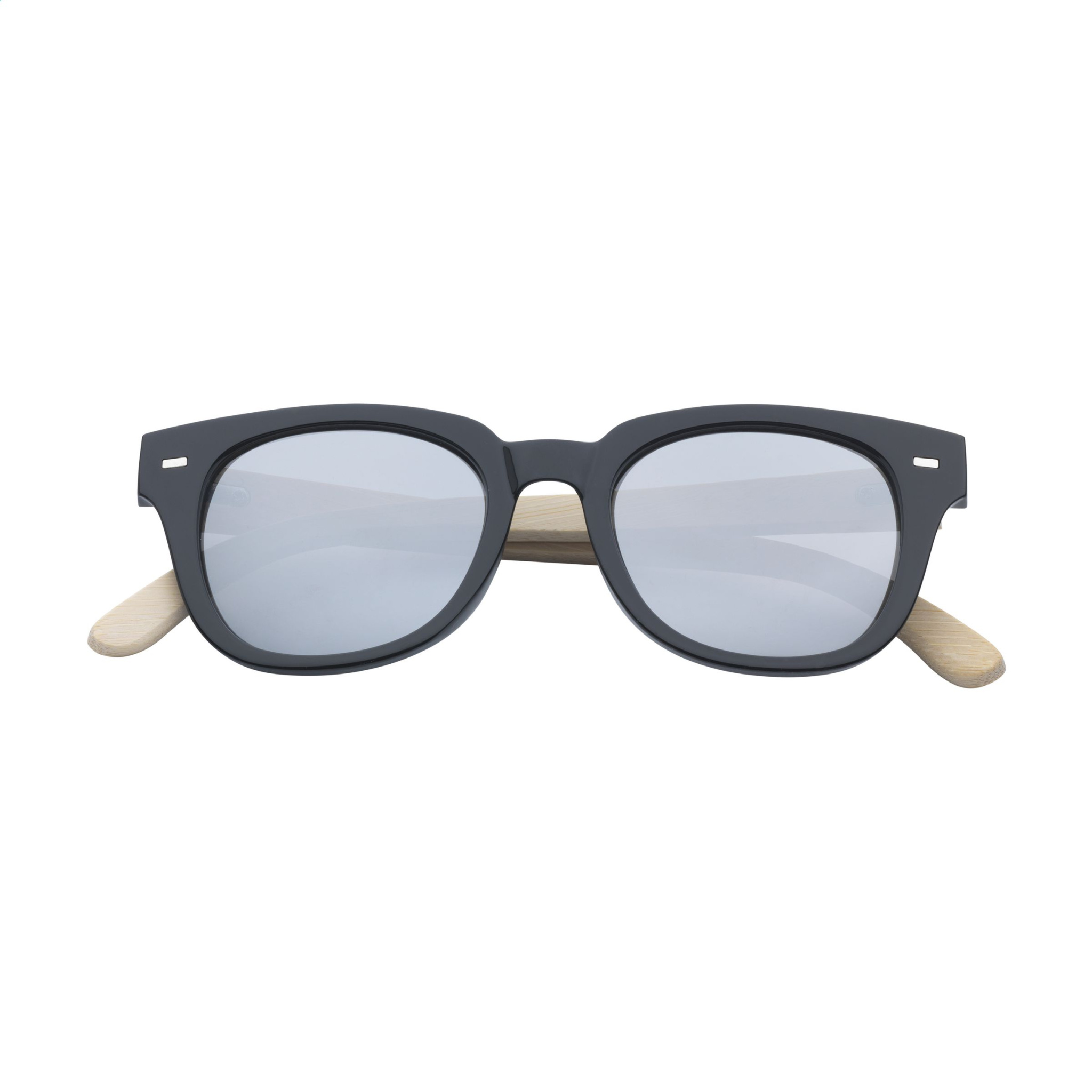 Striking sunglasses with mirrored lenses. The frame of this classic pair is made from sturdy plastic with arms made from bamboo. The mirrored lenses have UV400 protection in line with European standards. Each item is supplied in an individual brown cardboard box.