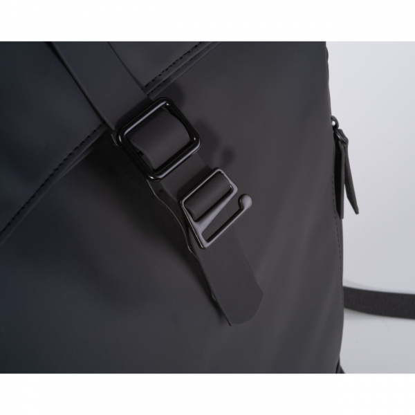 Laptop backpack made of polyurethane (PU) for 15–16 inch laptops. It features two zippered compartments on the front, two side slip pockets, a large main compartment with mesh and zippered sections, a padded laptop compartment on the back, padded shoulder straps, a carrying handle, and an adjustable closure for the main compartment. Your logo is applied to the lower third of the front side.