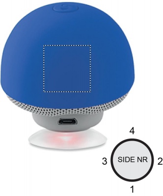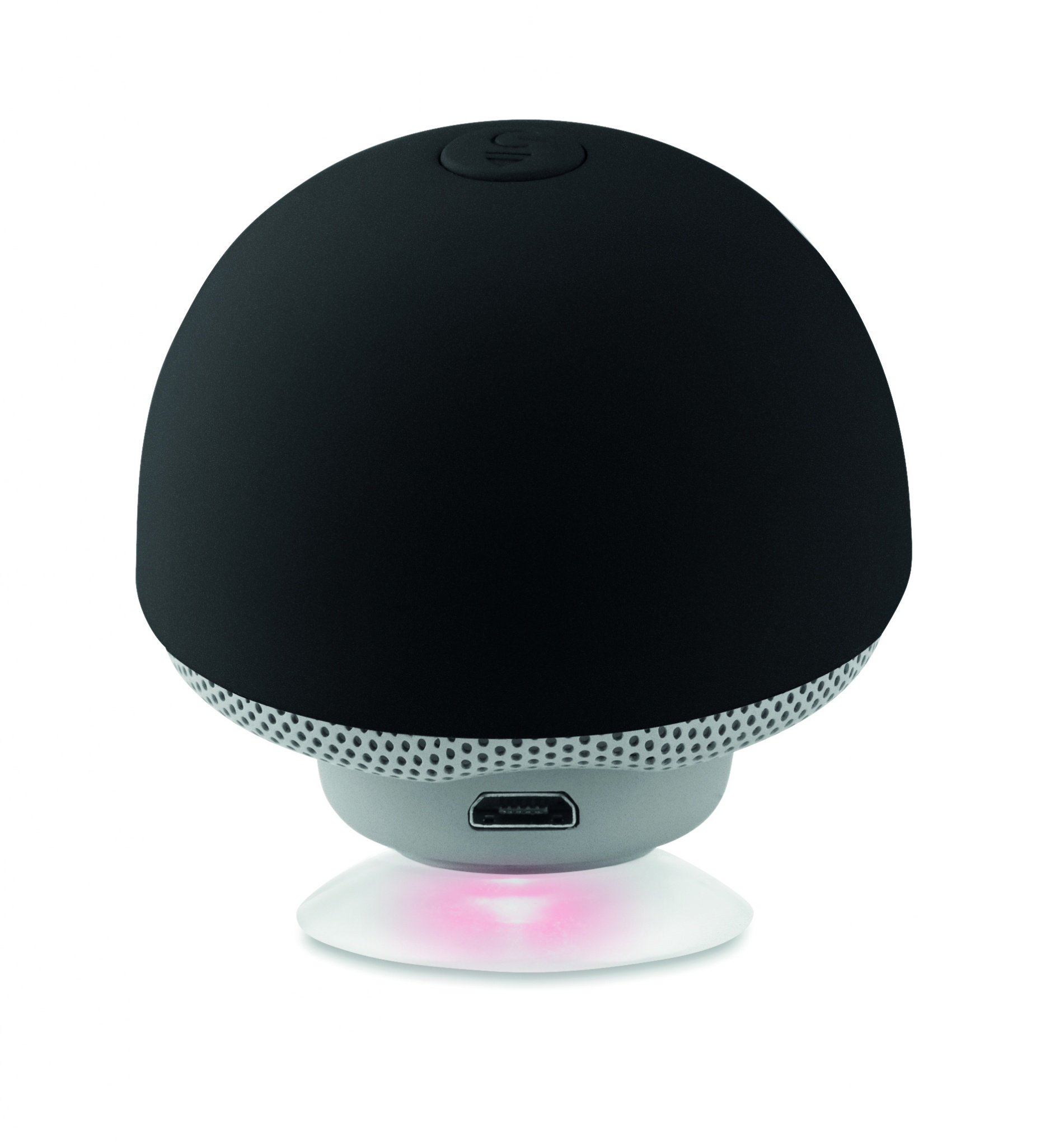 Mushroom shaped 5.0 wireless speaker/phone stand in ABS with suction cup. 1 Rechargeable Lithium 180 mAh battery included. Including USB charging cable and 3,5 mm plug. Output data: 4 Ohm, 5V and 3W. Playing time aprox. 2h.