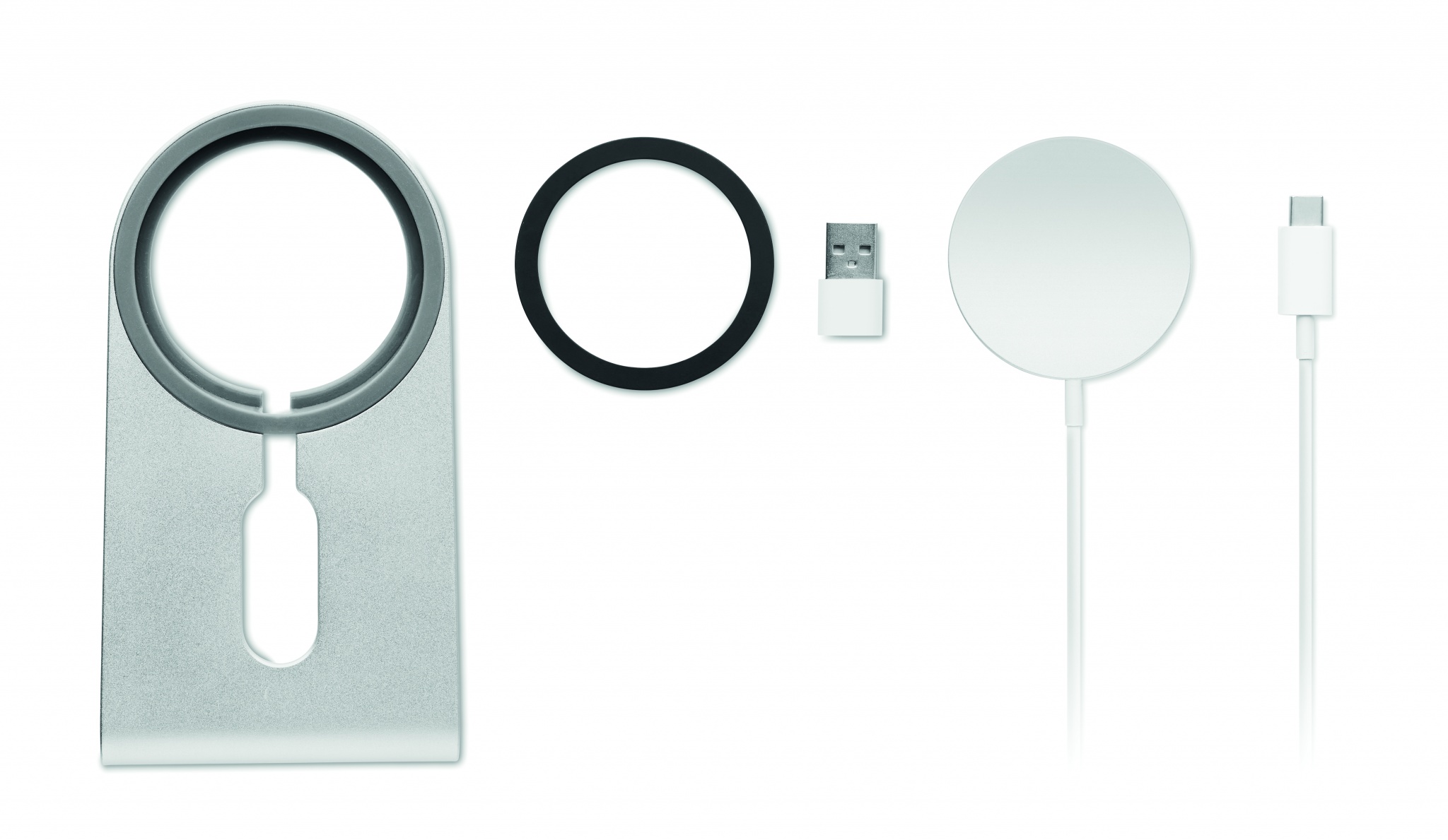 Magnetic Aluminium portable 15W wireless charger with phone stand. Including additional magnetic metal ring to support charging of other non-magnetic wireless chargeable phones. Output: 9V/1.67A (15W) for quick charging. Compatible with latest Androids, iPhone® 12 and newer.
