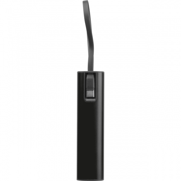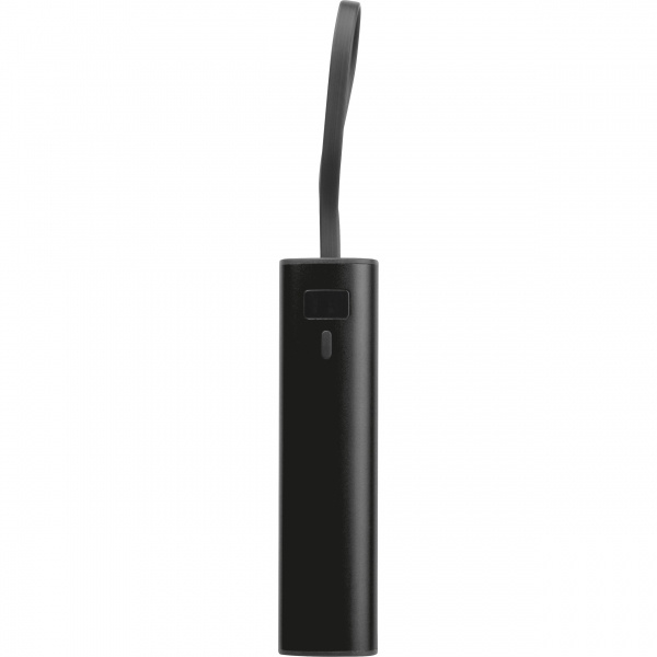 Power bank made of aluminum with a 5,000 mAh Li-ion battery, charge level display, and integrated USB-C charging cable. A 30 cm Type-A to Type-C charging cable is included. Your logo is applied below the display using laser engraving.