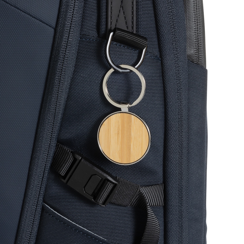 Round shape keychain made with RCS recycled zinc alloy and bamboo. Total recycled content: 73% based on total item weight. RCS certification ensures a completely certified supply chain of the recycled materials. Packed in paper bag.