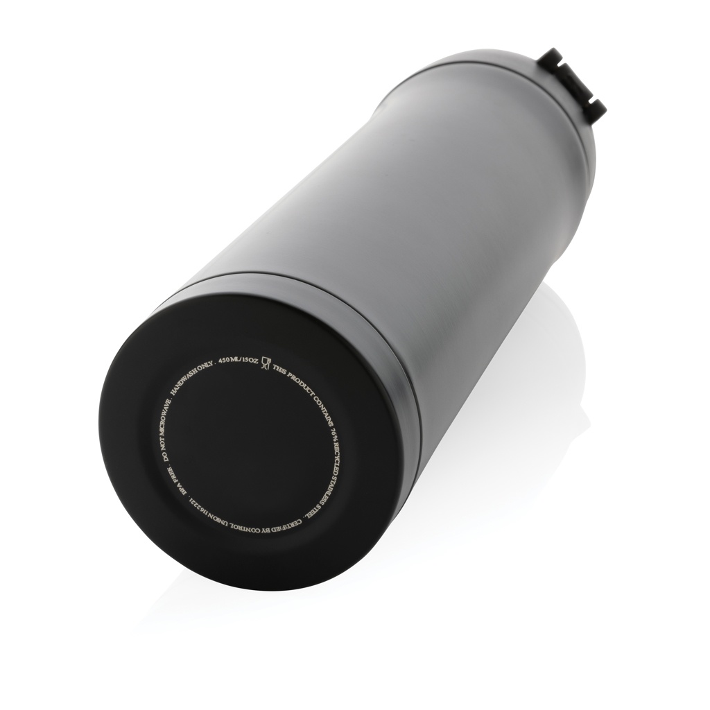 This great double wall stainless steel vacuum flask keeps your drink warm for up to 5 hours or cool for up to 15 hours. The lid is lockable and therefore avoids any risk of leaking or spilling. The lid is easy to keep clean for optimal hygiene and is dishwasher safe. The unique design of the flask allows you to drink conveniently and safely with one hand directly from the flask. The size of the flask is suitable to place in any car drink holder. Made with RCS (Recycled Claim Standard) certified recycled materials. RCS certification ensures a completely certified supply chain of the recycled materials. Total recycled content: 76% based on total item weight. BPA free. Capacity 450ml. Including FSC®-certified kraft packaging.