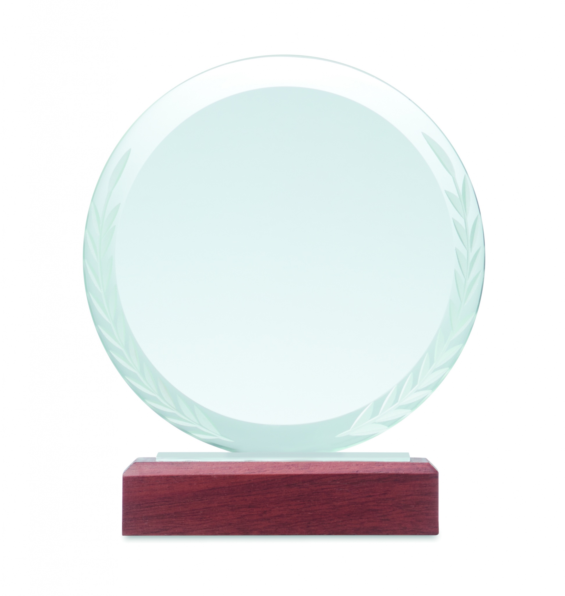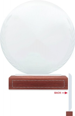Round crystal award or memorial plaque on a beech wooden base in a gift box.