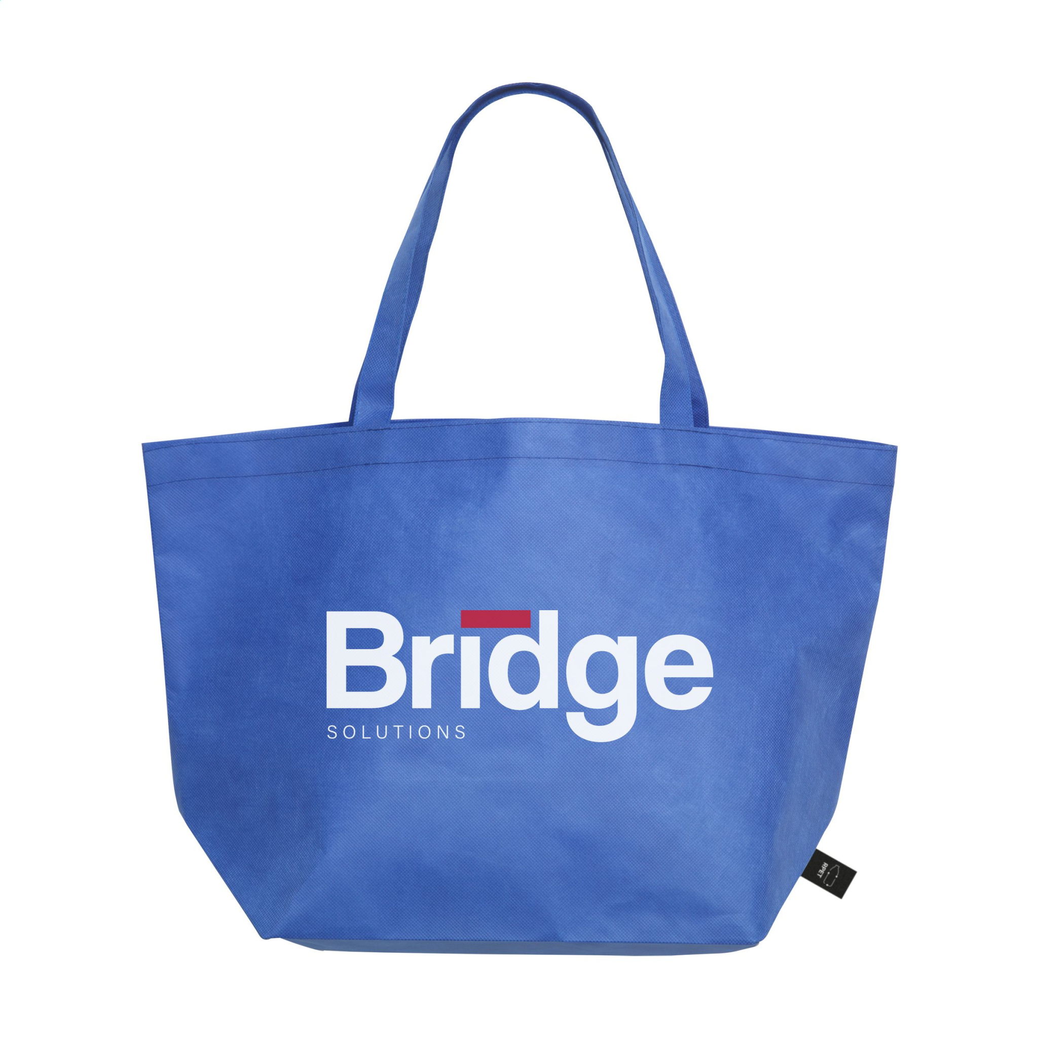Generous RPET non-woven shopping and beach bag (80 g/m²) made from recycled PET bottles. A wide bag, both strong and light with long handles. Capacity approx. 25 litres.