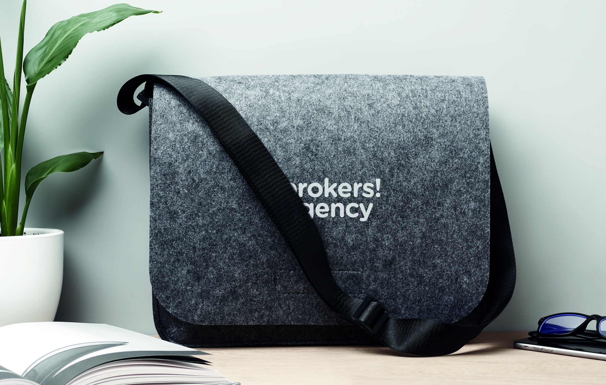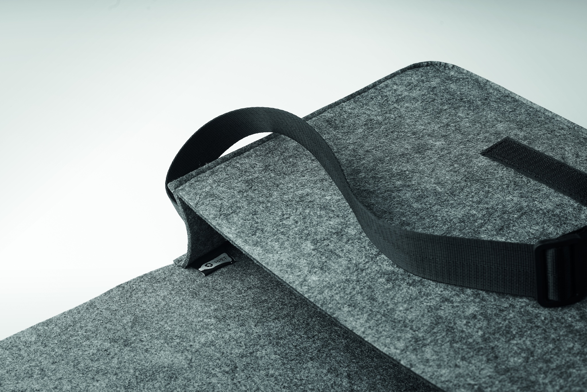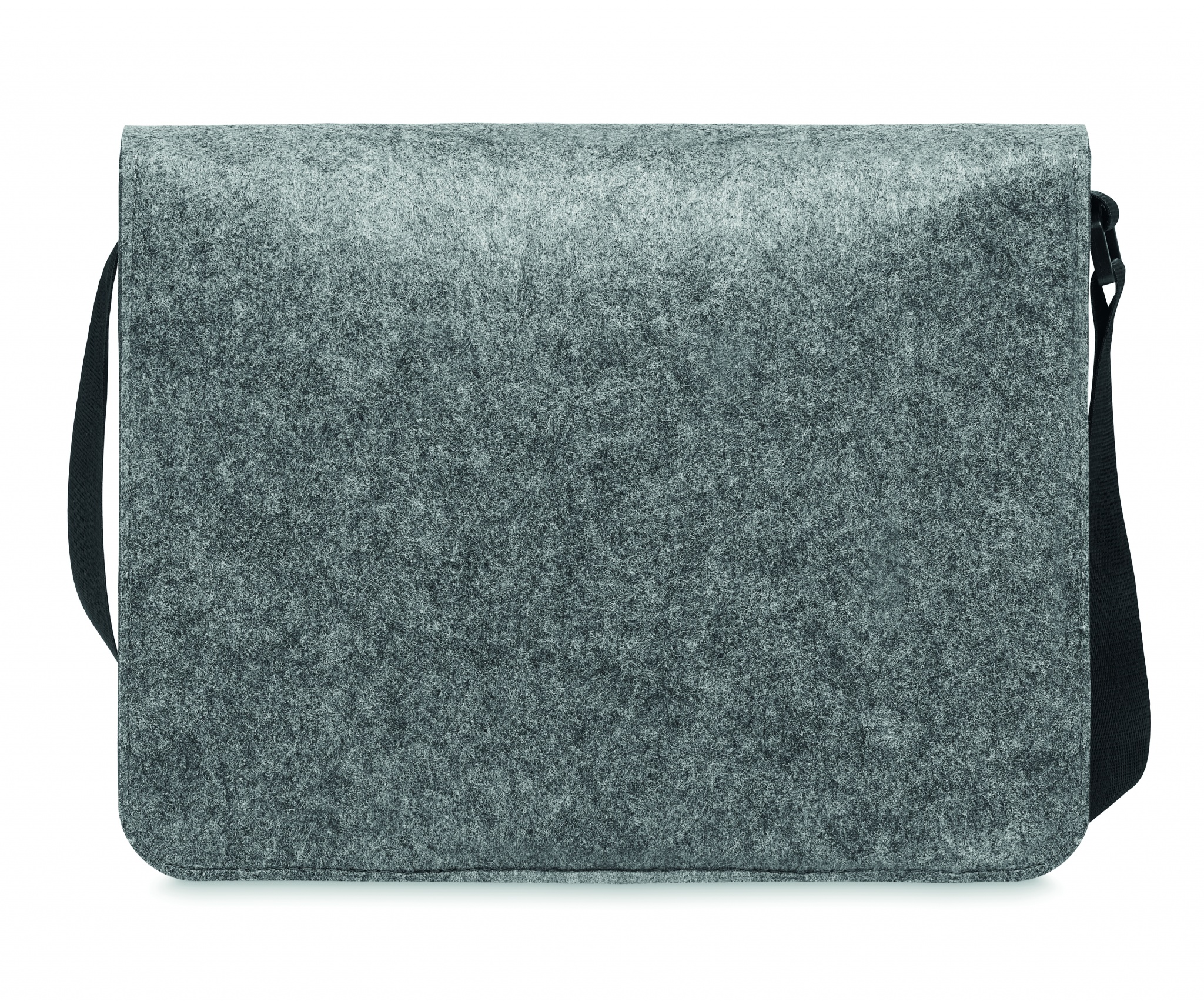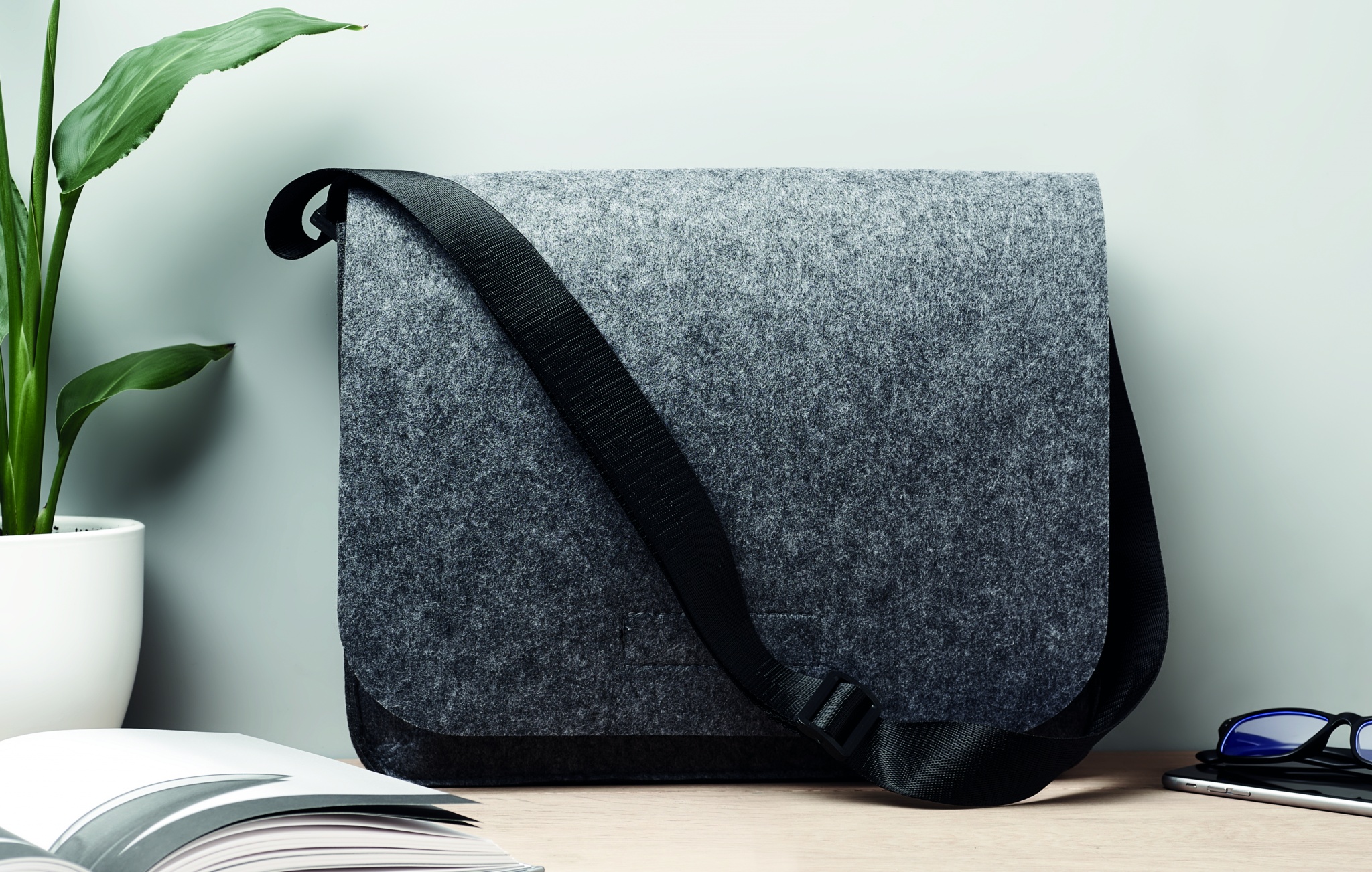 RPET felt messenger or laptop bag with hook and loop closure. Fits a 15 inch laptop.