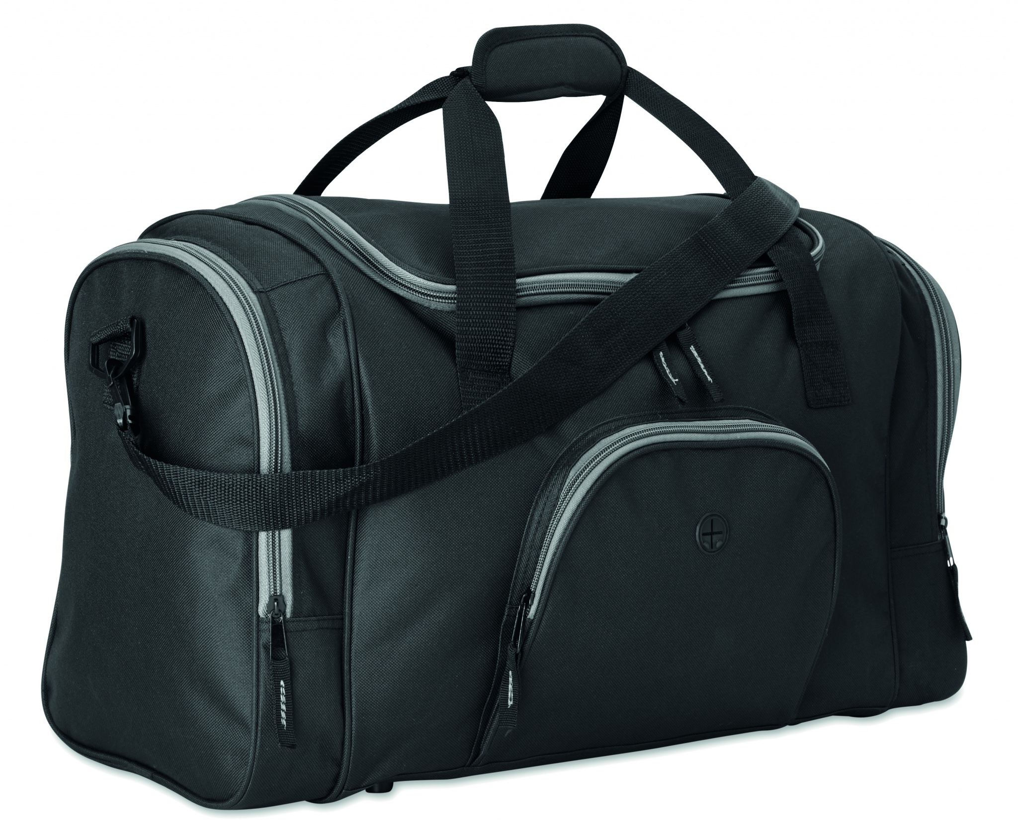 Sports bag in 600D polyester with 2 zippered side compartments and 1 zippered front pocket with earphone eyelet. Detachable and adjustable shoulder strap included.