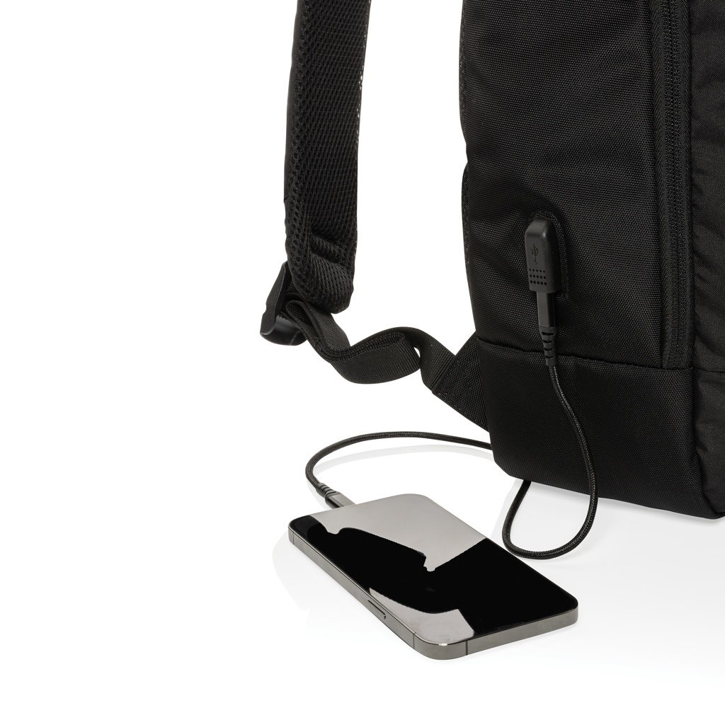This beautifully designed backpack will suit all your needs! Featuring one large main compartment for your 15.6 inch laptop and one front compartment. Connect your power bank easily to the integrated USB Type-C charging port and charge your phone or tablet on the go. With AWARE™ tracer that validates the genuine use of recycled materials. Each bag has reused 28.7 0.5L PET bottles. 2% of proceeds of each Impact product sold will be donated to Water.org. PVC free.
