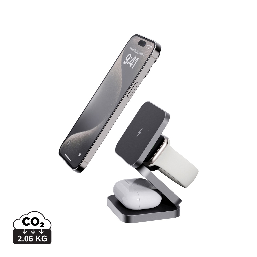 Luxury and foldable 3-in-1 wireless charger made with RCS recycled ABS and RCS recycled Aluminum. Total recycled content: 46% based on total item weight. RCS certification ensures a completely certified supply chain of the recycled materials. The wireless charger comes equipped with a magnetic 15W wireless charger and an additional 5W wireless charger suitable for earbud cases or other small wireless chargeable devices and a 2.5W wireless charger for smartwatches ( Apple watches only). Including RCS certified 120cm recycled TPE cable. Packed in FSC® mix kraft packaging. Item and accessories 100% PVC free. Input: 9V/3A for optimal use. Output: Phone: 9V/1.1A; 9V/1.67 A/(15W), Earbuds: 5V/1A (5W), Watch: 5V/0.5A. PVC free.