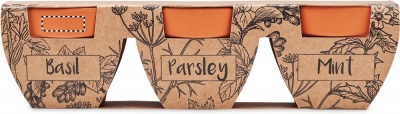 Set of 3 clay terracotta pots including 3 different seeds of 3 different herbs: mint, parsley and basil. Made in EU.