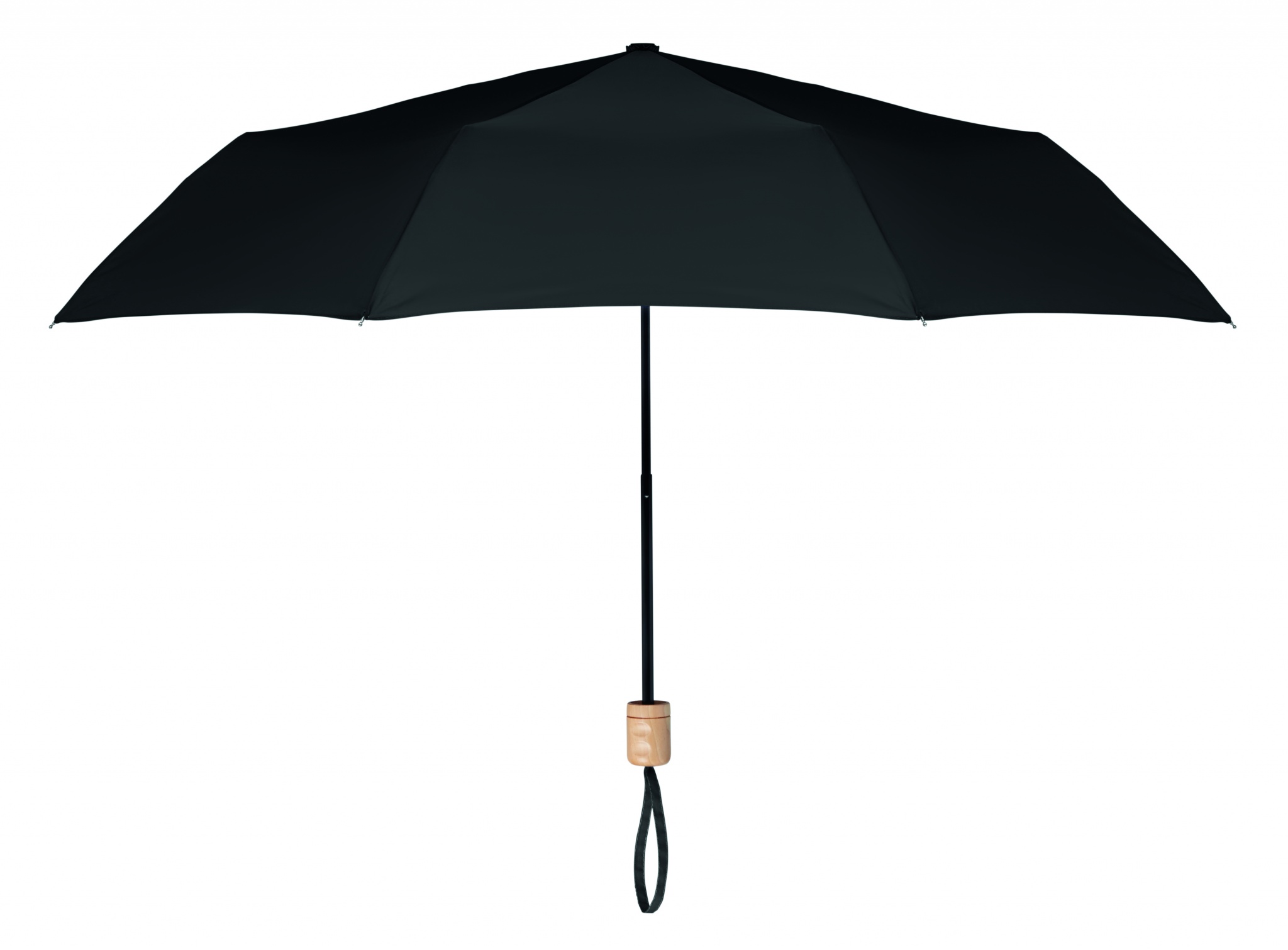 Kokkupandav 21-tolline vihmavari, 3 sektsiooni 190T RPET pongee-kangaga, musta kaetud raam ja puidust käepidemega ribid. Käsitsi avamine ja sulgemine. Iseseisvast materjalist kott.