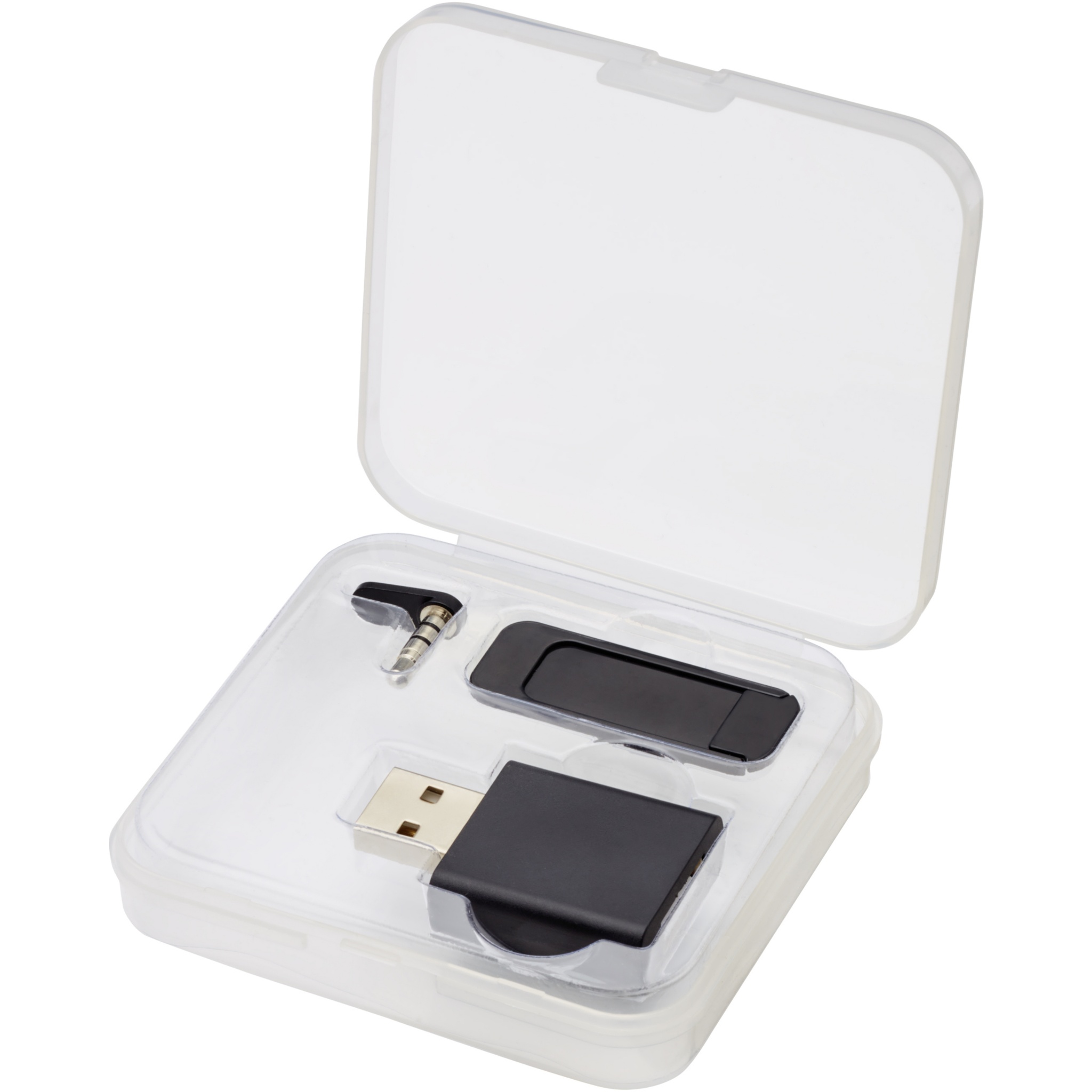 Digitaalne privaatsuskomplekt, mis sisaldab USB-andmete blokeerijat, veebikaamera blokeerijat ja helipistiku blokeerijat. USB-andmekaitse hoiab ära juhusliku andmevahetuse, kui ühendate mobiilseadme arvuti või avaliku laadimisjaamaga. Üksus blokeerib seadme laadimise ajal igasuguse andmeedastuse, vältides andmete varastamist või pahavara installimist. Veebikaamera blokeerija saab kinnitada sülearvuti veebikaamera ette, et blokeerida soovimatu juurdepääs veebikaamerale. Helipesa blokeerija saab asetada seadme AUX-porti, et vältida kolmandate isikute vestlusi kuulamast. Tarnitakse kaitsvas karbis.