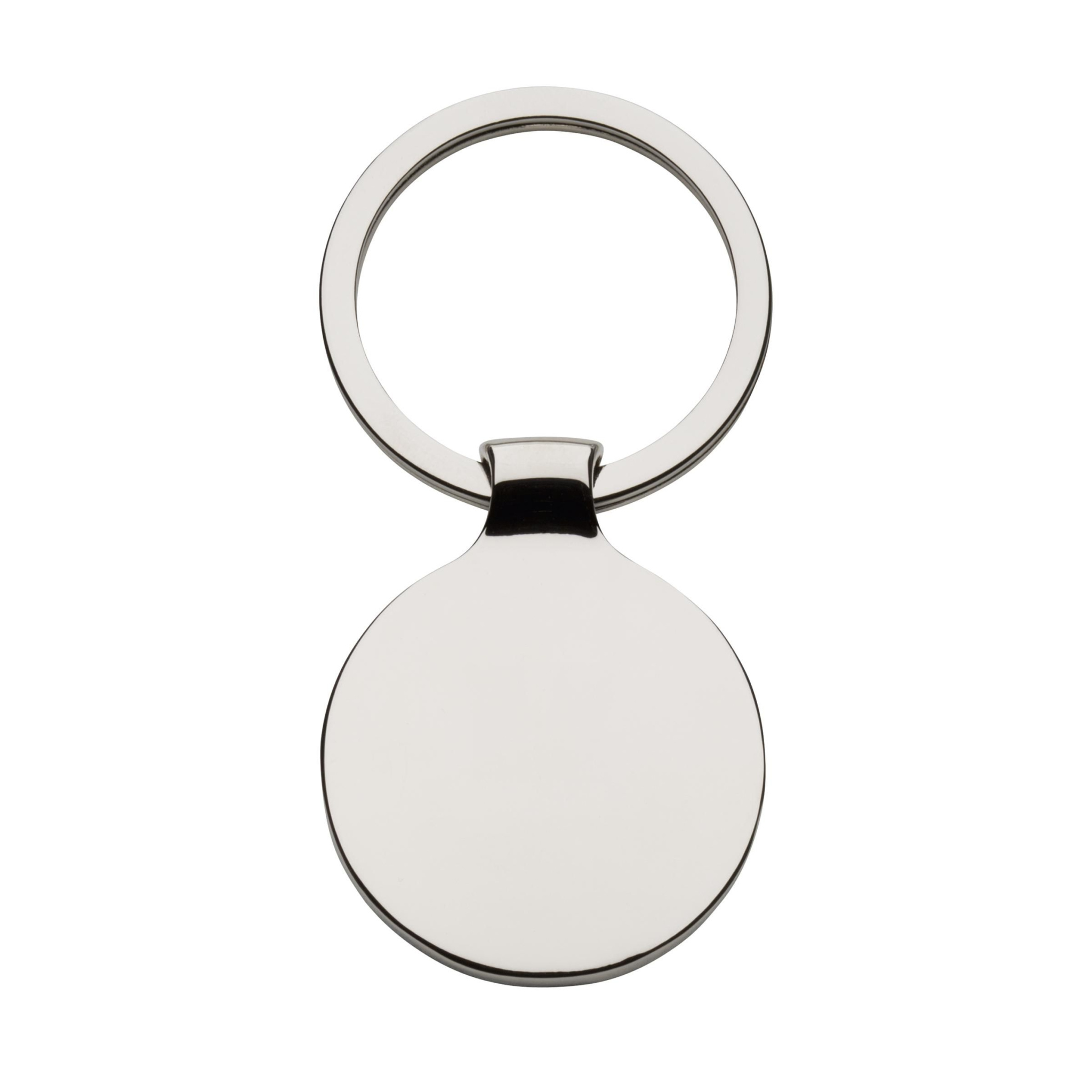 Ümmargune poleeritud nikkelmetallist võtmehoidja musta sisekujundusega ja tugeva võtmehoidjaga. Iga ese tarnitakse eraldi pruunis papist ümbrikus.