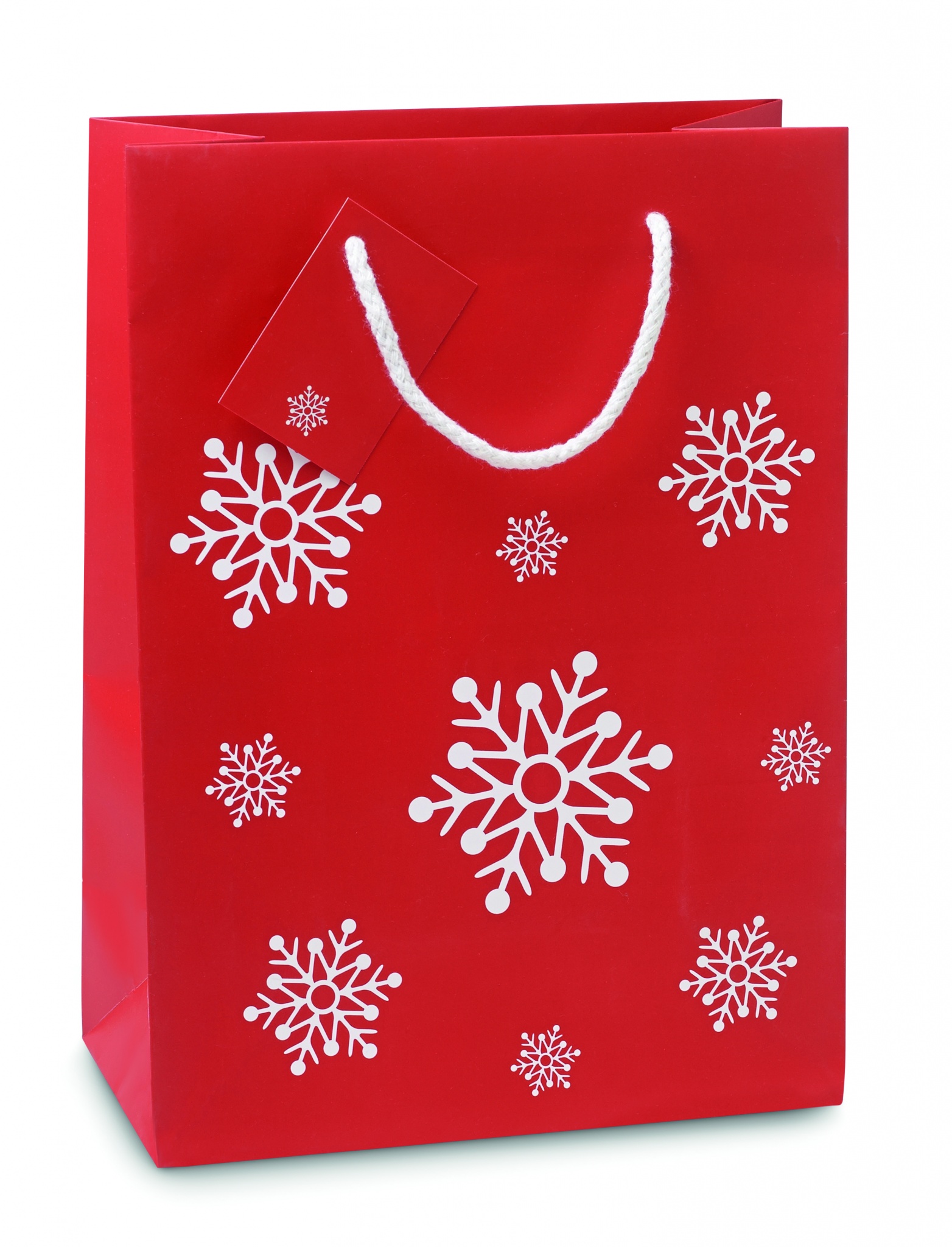 Elegantne lumehelveste mustriga kinkepaberkott. Kaasas kingitussilt. Keskmise suurusega.