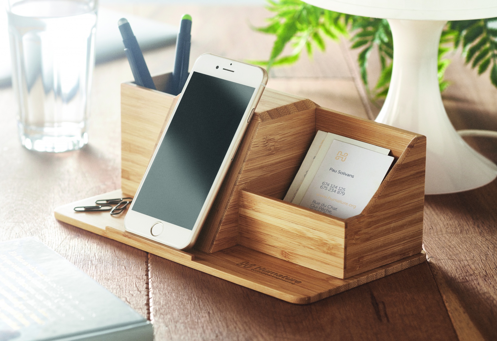 Bambusest laua- ja pliiatsihoidja 10 W juhtmevaba laadimisega telefonialusega. Väljund: DC 9V/1.1A (10W) kiireks laadimiseks. Ühildub uusimate Androidide, iPhone® 8 ja uuemate versioonidega. Bambus on looduslik toode, ühe eseme värvis ja suuruses võib esineda väikesi erinevusi, mis võivad mõjutada lõppviimistlust.