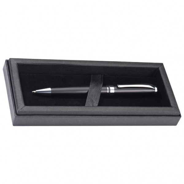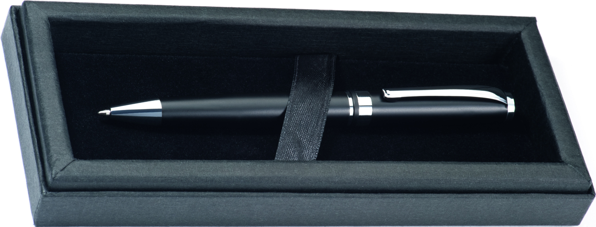 Kvaliteetne metallpliiats, mattmust, läikivate hõbedaste aplikatsioonide ja elegantse korpusega. Graveerime teie logo klipi alla.